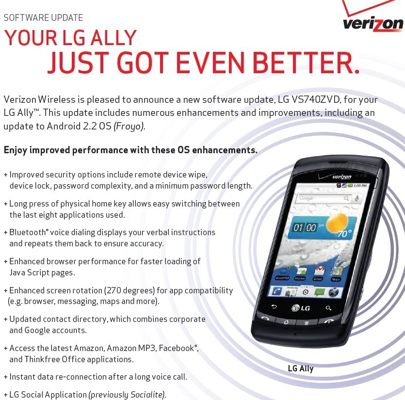 LG Ally has just received Android 2.2 Froyo earlier than expected, so Verizon users can consider themselves lucky. We’re dealing with a 52.3MB software package, updating the device to Android 2.2 VS740ZVD. The update brings the usual improvements: better security (remote phone wipe, locking, complex passwords), switching between the last 8 apps used and voice commands enhancement.