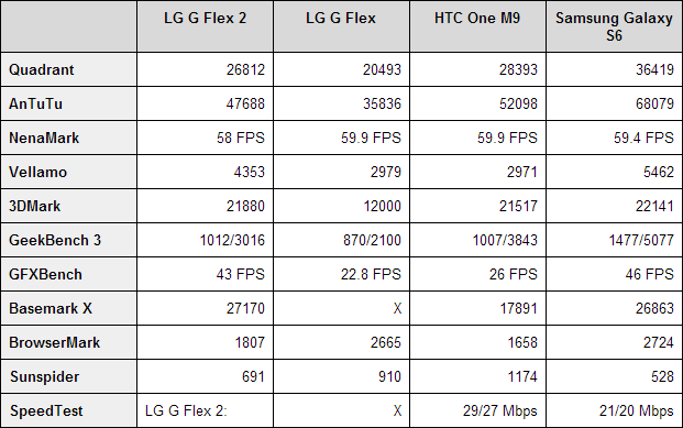 Calls were loud and the signal was good. We also did benchmarks, comparing the G Flex 2 to the G Flex 1, HTC One M9 and Galaxy S6. These are the results: