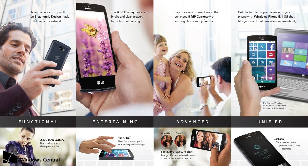 There’s a Snapdragon 410 1.2 GHz processor inside, 1 GB of RAM and an 8 megapixel back camera. Windows Phone 8.1 Update 2 is the OS here and we also get a microSD card slot and a 2100 mAh battery. LG also included some trademark features here like Knock On, QuickMemo, Gesture Shot, Soft Light for selfies and Live Shot. No idea when this smartphone is released or what its price is…