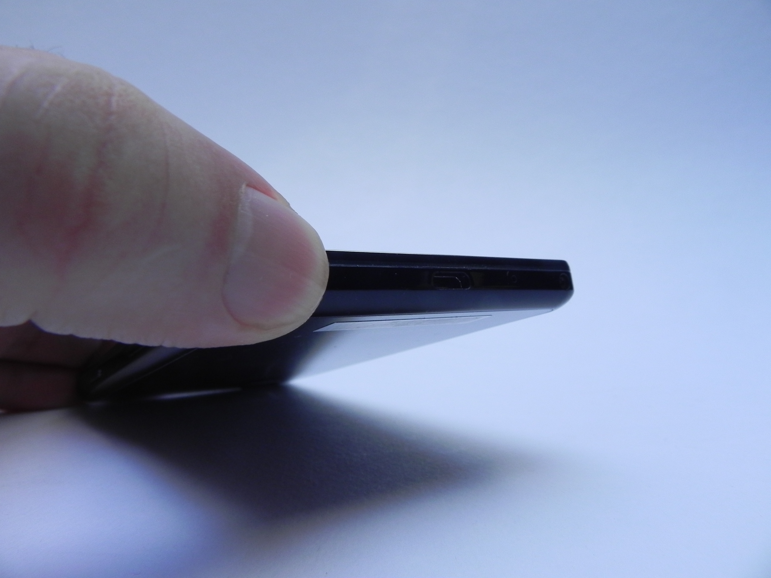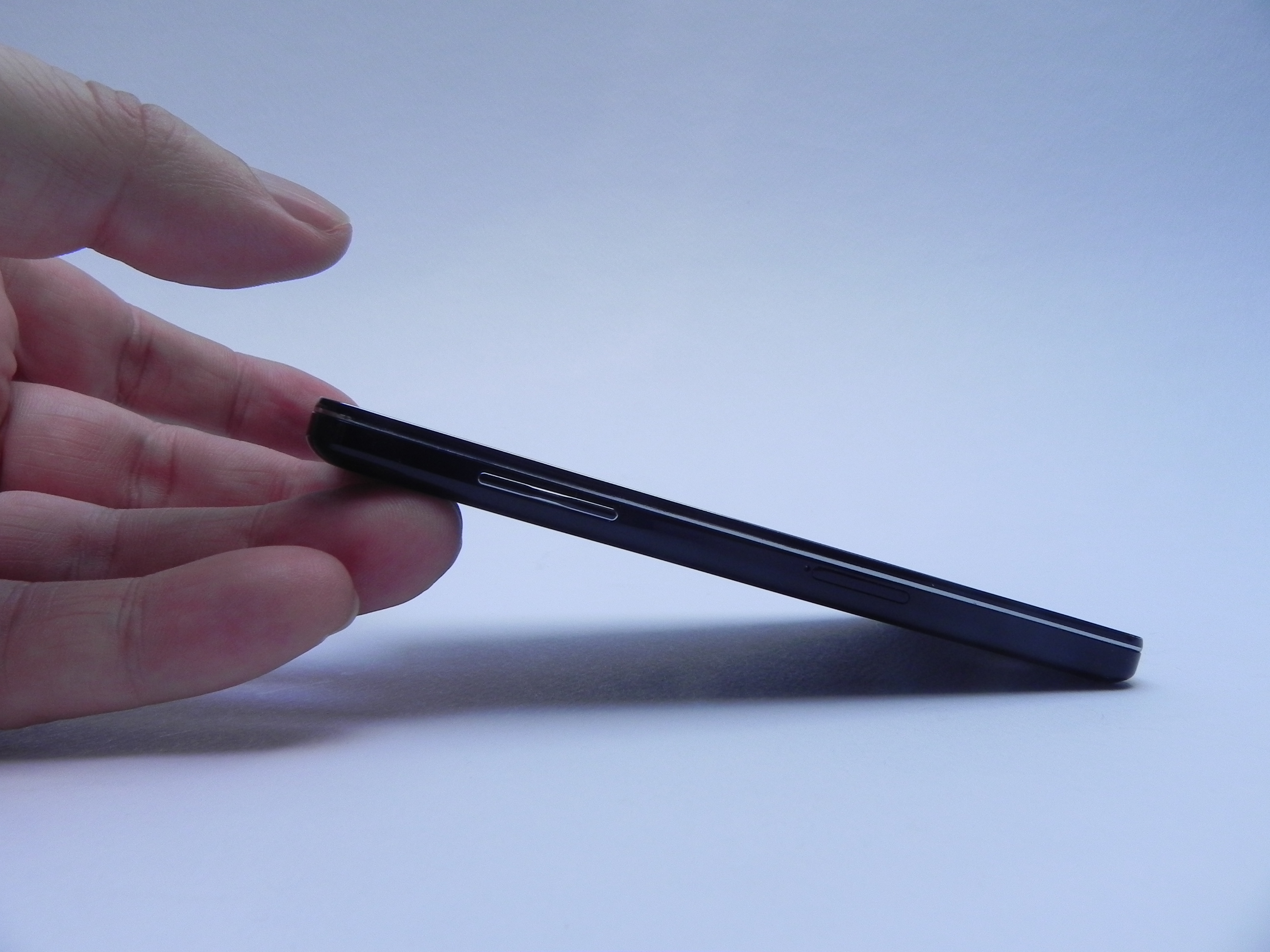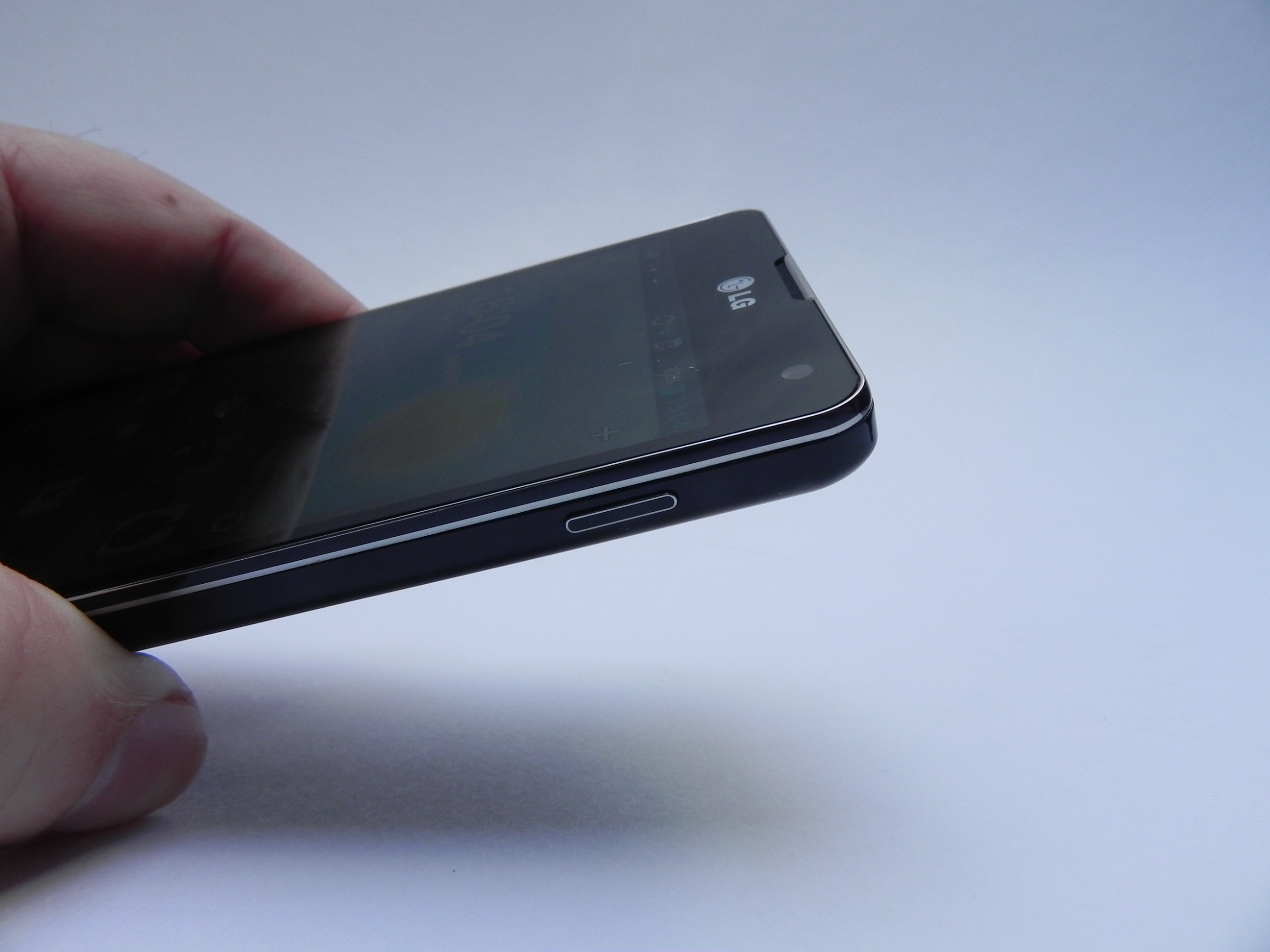 The handset measures 8.5 mm in thickness and weighs 145 grams, plus it has a glass back like the Nexus 4. There’s a dotted texture at the back and we’ve also got a stainless steel frame, a thin one around the handset. The phone is wide, wider than the Galaxy S III and that gives us a wider virtual keyboard. The smartphone is completely flat and without curves, although the corners are slightly rounded.
