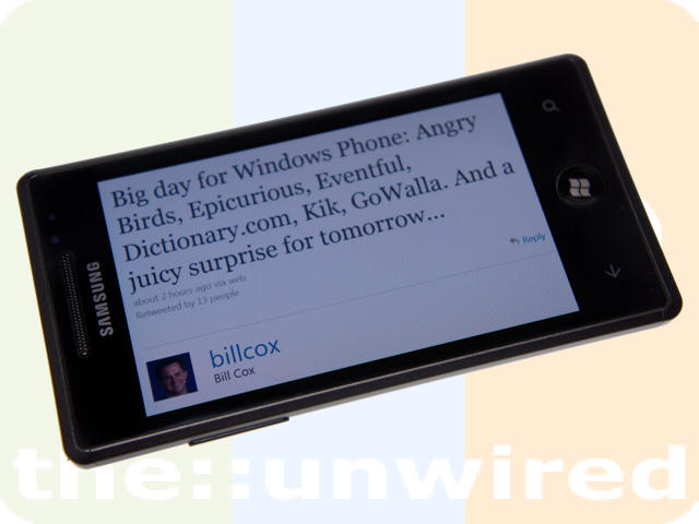 Microsoft will announce some software releases for WP7, including Angry Birds, Kik and GoWalla, but the surprise is something else entirely. Cox might refer to the Mango Beta ROM release for developers or maybe the availability of Mango developer smartphones. The latter will please us greatly, since there’s bound to be a leak of pictures, if this happens.