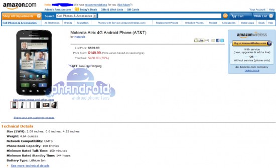 Amazon managed to leak the price for Motorola Atrix 4G, afterwards removing all traces of the erroneous page, but still there’s the screenshot below as proof. The product is priced at $149.999 with a 2 year contract most likely, which is excellent considering the features of this great smartphone.