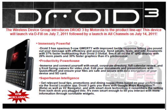 After being announced in China as the Milestone 3, Motorola Droid 3 is now part of a fresh leak in the US. This leak helps us learn that the follow-up to the Droid 2 and Droid X2 will be coming to all distribution channels on July 14 2011.