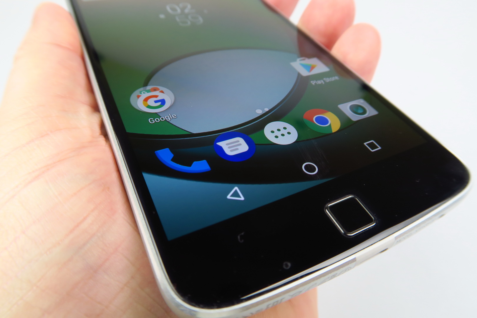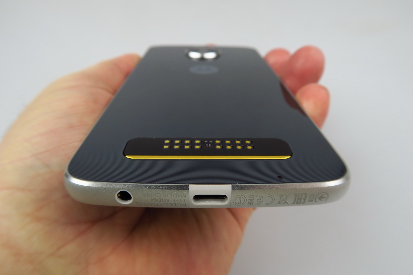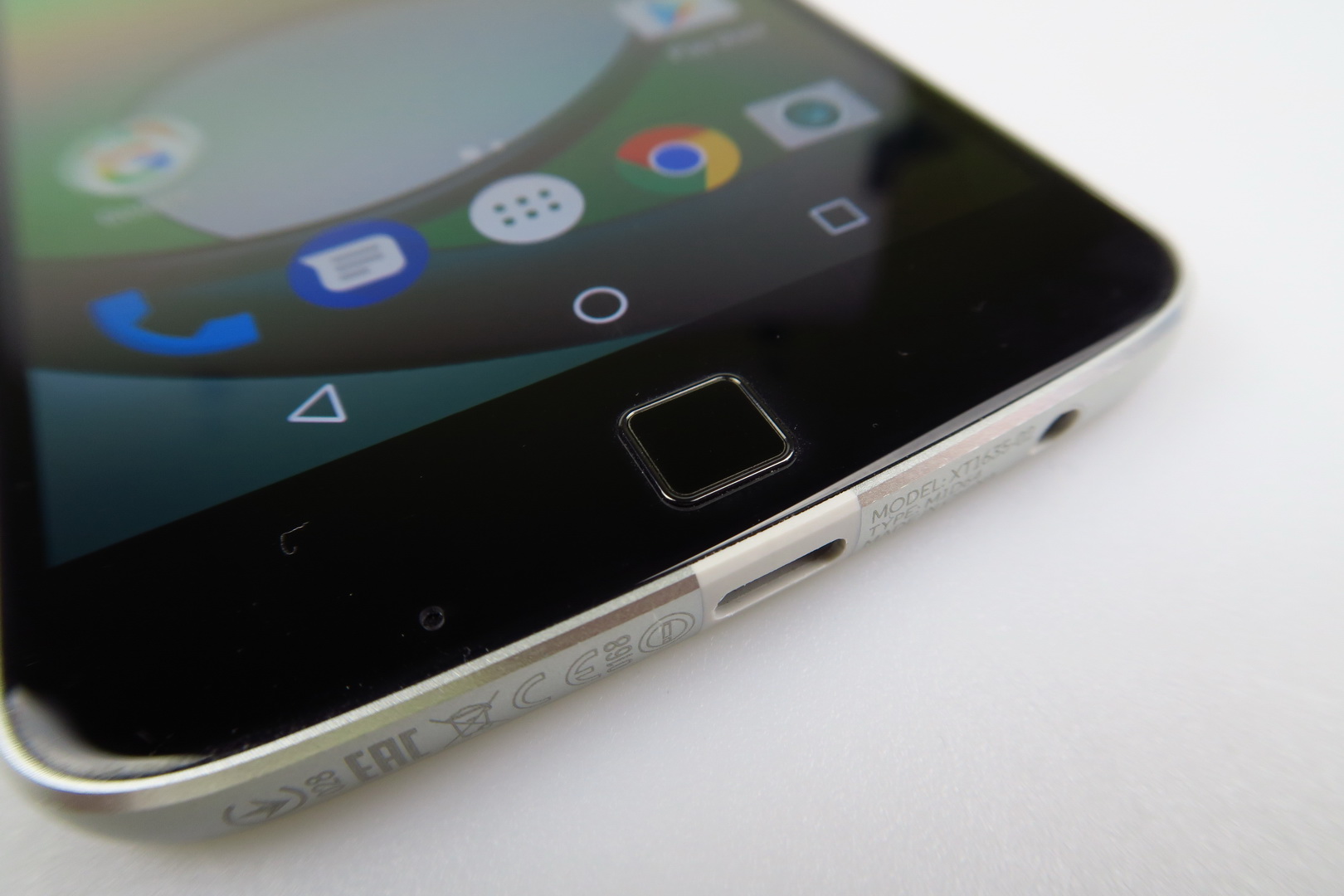 It’s a sturdy metal frame and the build is quite good in general. We’ve got a glass back here and a pretty shabby looking fingerprint scanner upfront. The handset is 7 mm in thickness and weighs 165 grams. This 5.5 incher is no match to the anorexic Moto Z and its 5.2 mm and 136 gram format, but it’s still quite slim. Moto Z Play does remain quite wide and has some pretty rough edges.