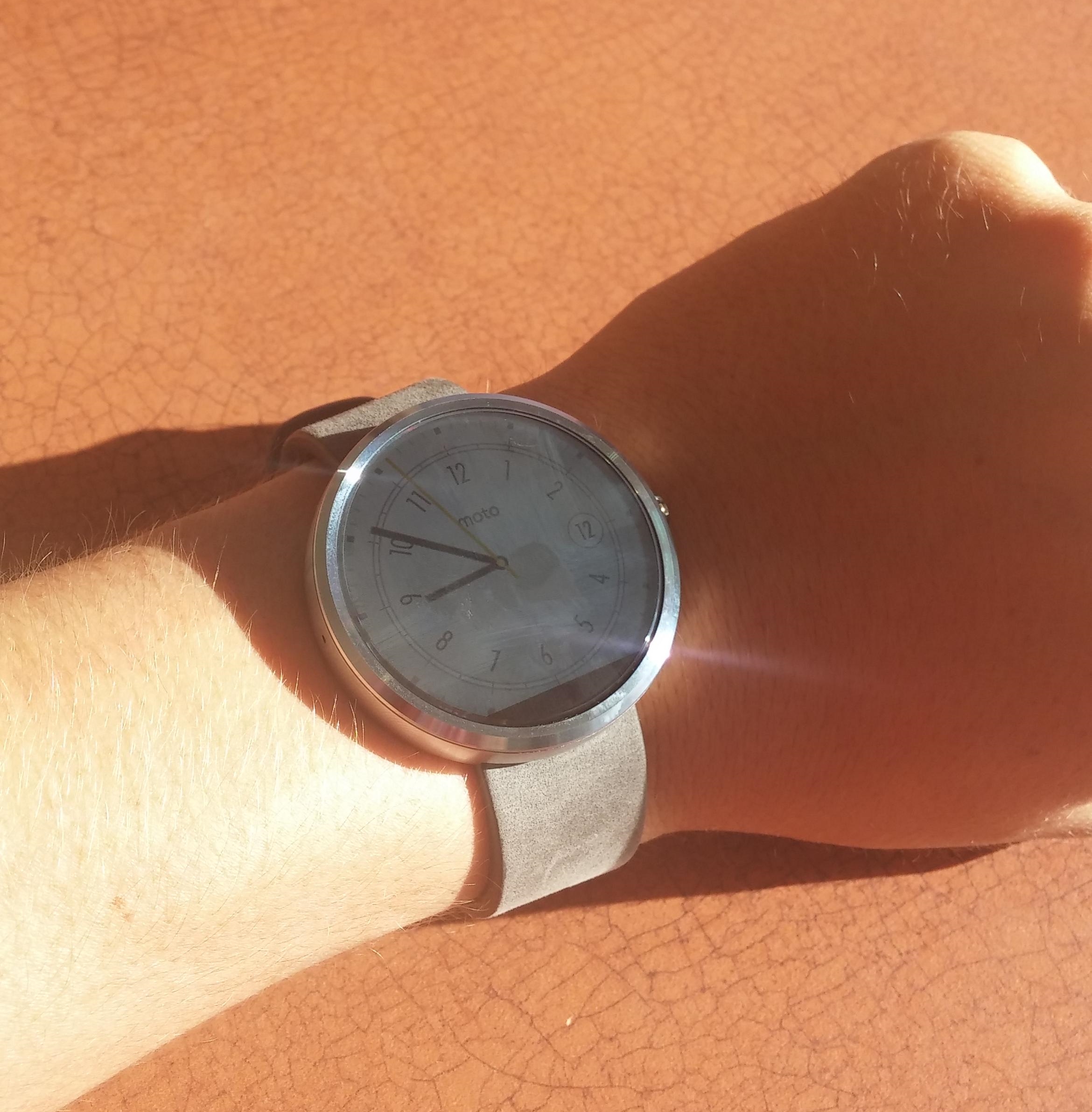 We get to know the fact that the Moto 360 was set to minimum brightness (Value = 1). In order, you can see how the display manages to handle outside, and in direct sunlight. The results are pretty impressive taking in consideration that the brightness is set to the minimum value. In such a configuration, we’ll get both a good experience with the watch and a higher battery lifetime.