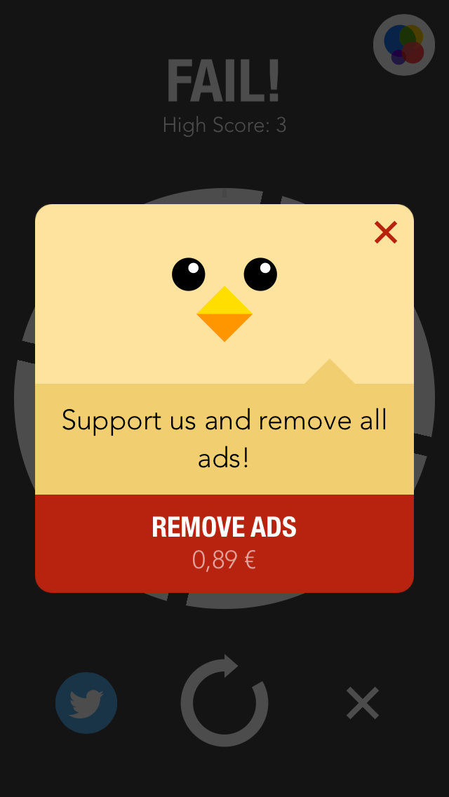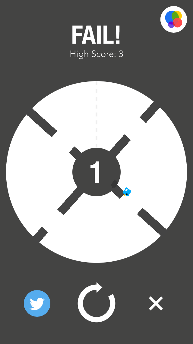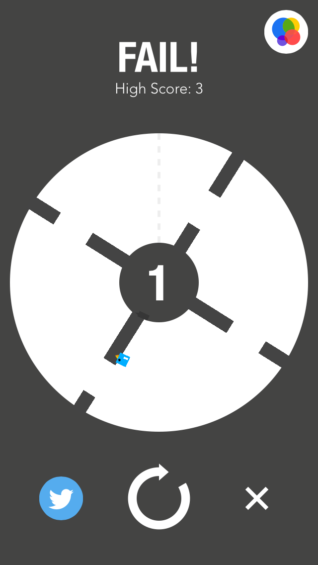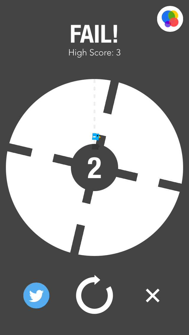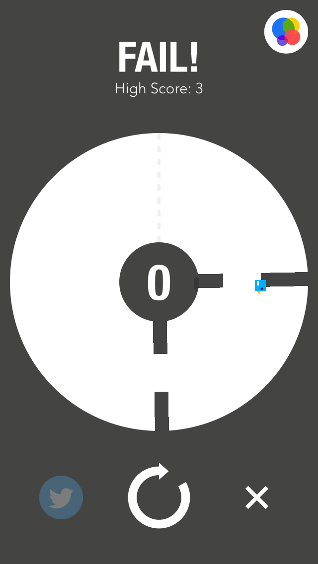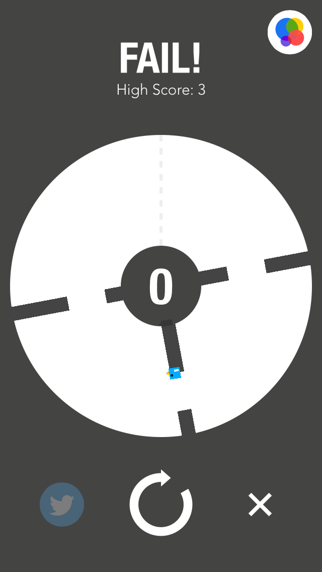 We’re dealing with Flappy Bird with a twist, as you control a square bird, that spins around in a circle and has to avoid some obstacles. Those obstacles go up and down as you progress and they’ll multiply and change pattern at some point. Each 5 rotations the background changes colors and more obstacles are added. The game takes up 4.7 MB of storage and it’s made by 1 Button.
