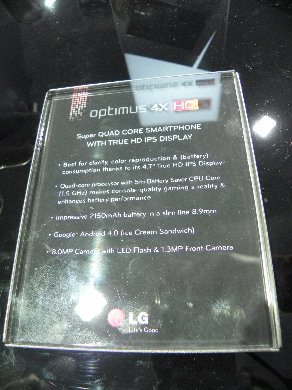 The design is traditional for the Optimus series and there’s a nice texture at the back. In contract with the latest HTC One models, the LG Optimus 4X HD has a removable battery and it holds back from customizing the Android 4.0 stock experience too much, which is good news, since I wasn’t a fan of the LG Optimus UI. And now here’s a rundown of the specs for this model: