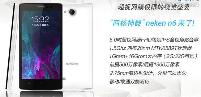 Neken N6 is a new quad core Full HD phone packing a 1.5 GHz MediaTek processor and the device is the one pictured below, but what interests us is a hardware feature of the model. It has been recently upgraded with an interesting spec.