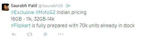 The Moto G (2014) will debut in India on September 5th and Flipkart will sell it exclusively, so that’s how they know so much, according to this source. The device is said to feature a Snapdragon 400 CPU, 1 GB of RAM and a 5 inch HD display. Another leak from Brazil mentions a price tag of around $445 for the new Moto G, that seems a bit steep. As shown in the tweet below the pricing is expected to be around 11.000 rupees, which should be $181. Is Motorola afraid to name this unit the G2 for fear of LG G2 confusion? I wonder…