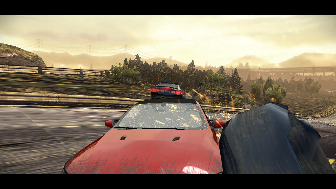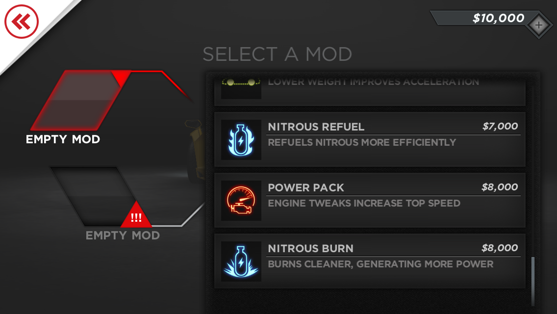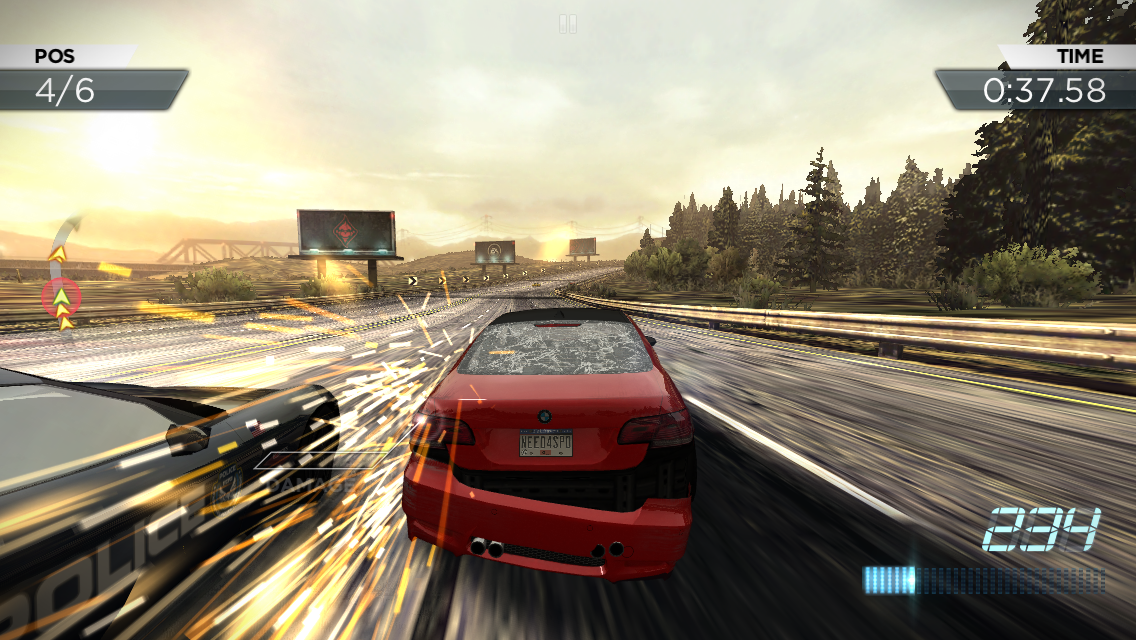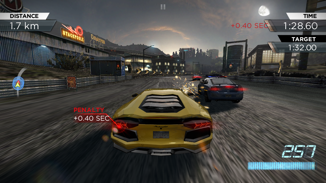 Mods include faster Nitrous recharge, lighter chassis, resilience against spikes and a few more. Luckily cars also have visible damage, so you’ll see your fender dropping and your windshield cracking after a while. Usually you’ll take hits from the police cars, that will come in waves and torment you, particularly in races against time. There are 10 tracks to race on, but the variety is great, since you can race on them in both backward and forward mode and in different times of day (night, day).