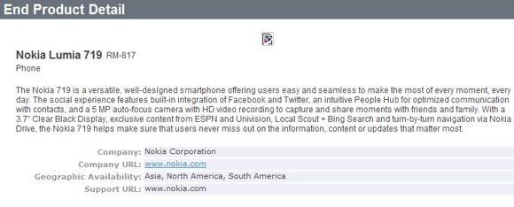 The Bluetooth SIG description mentions Twitter and Facebook integration, plus the use of People Hub to communicate with contacts. Nothing big here, honestly, since those kind of features we see on all WP devices out there. Lumia 719 is also supposed to come with a 3.7 inch Clearblack display and a 5 megapixel camera with HD video capture. Till now it all sounds very much like the Lumia 710 and I really can’t spot a solid difference. Other features include unique content provided with the handset, stuff like ESPN content, Unvision, Local Scout and Bing Search.