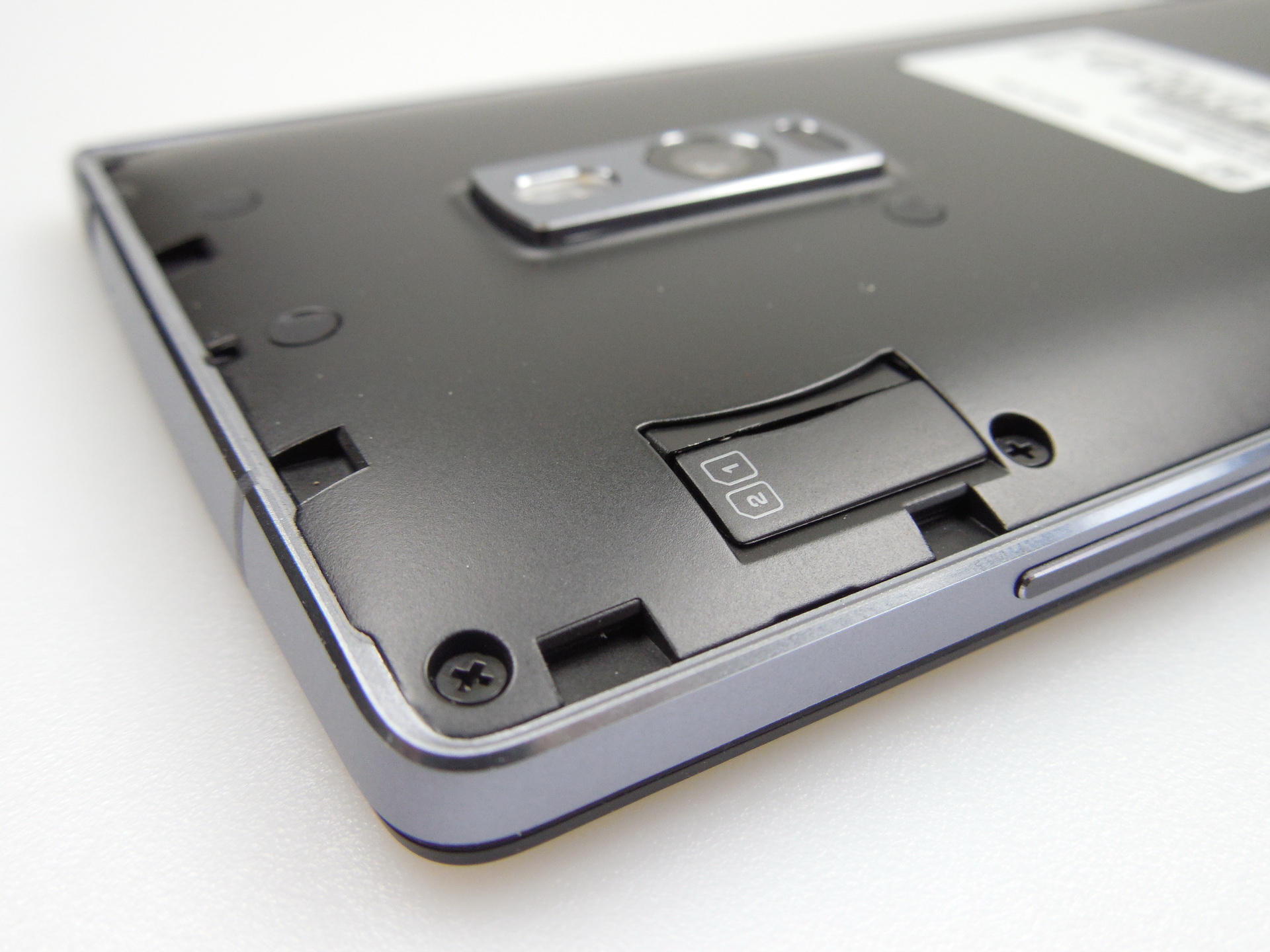 The handset has big bezels and moving to the back, we find here the sandpaper texture, that tends to gather dirt. Also at the back there’s the main camera, laser AF mechanism and dual LED flash. The camera has a strange placement, being much lower than usual at the center back side. If you remove the back cover (which is not easy to do), you will reach the non removable battery and two nano SIMs on a single tray.