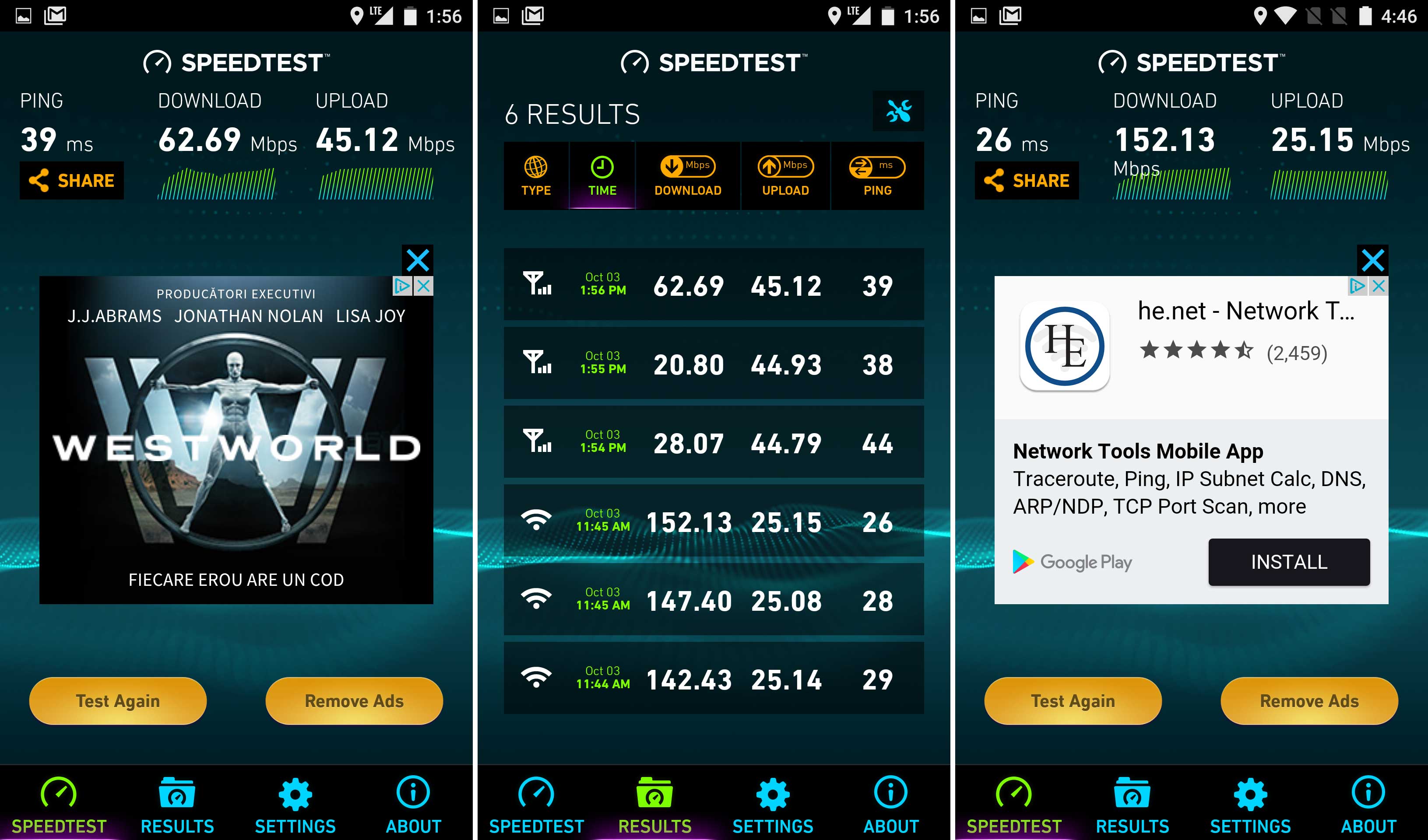On the connectivity front, we’ve got an USB Type C port here, LTE Category 6 support, WiFi a/b/g/n/ac, Bluetooth 4.2, NFC, GPS and Glonass. The dual SIM slots are of the nano SIM kind and then there’s also WiFi Direct and DLNA. Calls are loud and clear, there’s good noise cancelling and the signal was OK. We did some Speedtests and achieved 62 Mbps in 4G downloads and 45 Mbps in upload, a pretty good result, plus 152 Mbps in WiFi download and 25 Mbps in upload. Connectivity is great overall, so no qualms here.