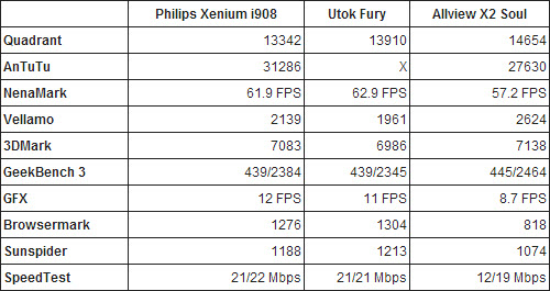 The browser on the smartphone isn’t very fast, but the stock keyboard is quite comfy. The telephony section brings 3G only on one SIM card at a time, dual standby support and a powerful signal on both cards. The calls are loud and clear and we’ve also got speed dial. Now we get to the benchmarks, where we compared the Philips I908 with the Utok Fury and Allview X2 Soul.