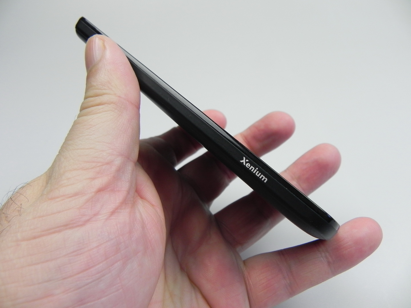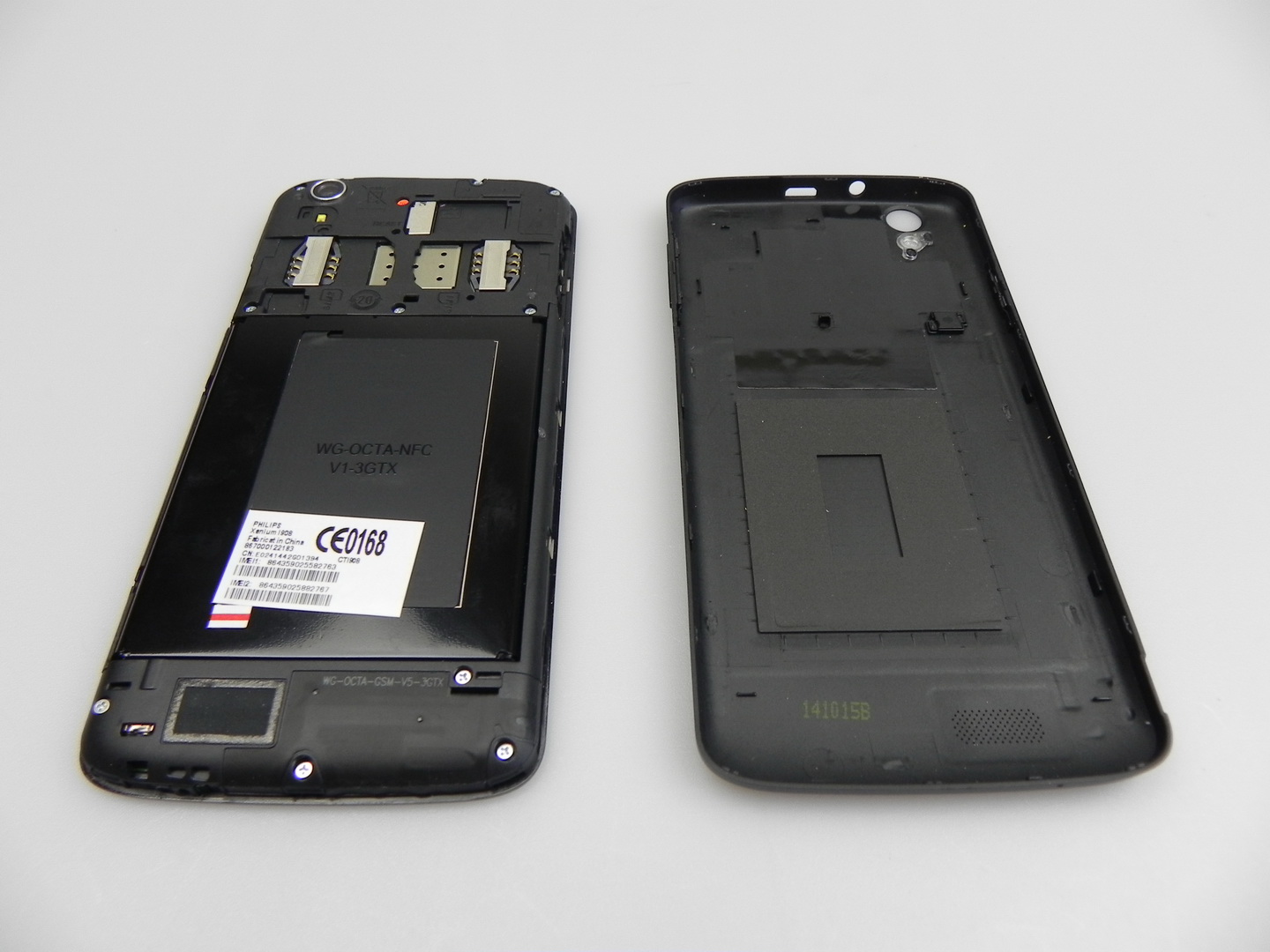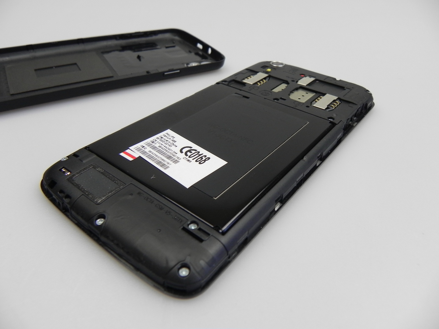 Below the cover there are two regular SIM slots, a reset button and a microSD card slot. At the top we find an audio jack and microUSB port, plus at the bottom there’s a microphone and on the left we find the volume buttons, that are quite comfy to use. On the right side there’s the On/Off button, with good feedback and overall the design of the Philips Xenium i908 is quite OK, but maybe a bit too elongated.