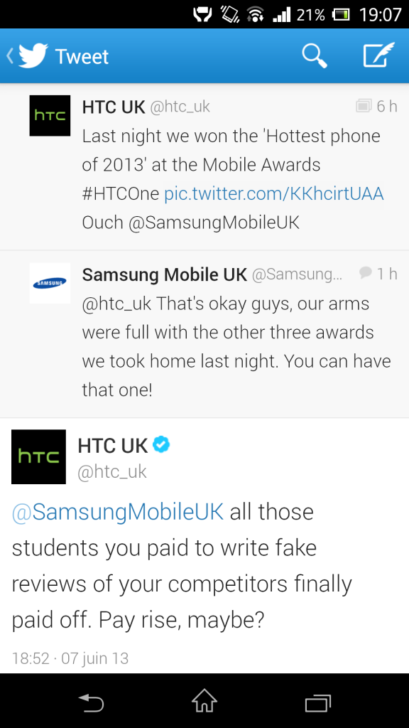 Samsung UK quickly replied, by saying that their arms were so full of awards (3 of them), that they let HTC have that one. And then HTC UK got serious and replied, reminding Samsung of the students paid to write fake reviews of the competition. They also asked for a pay raise for those students.