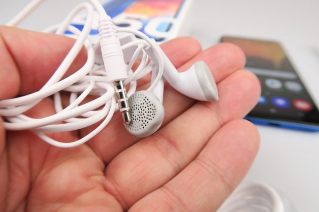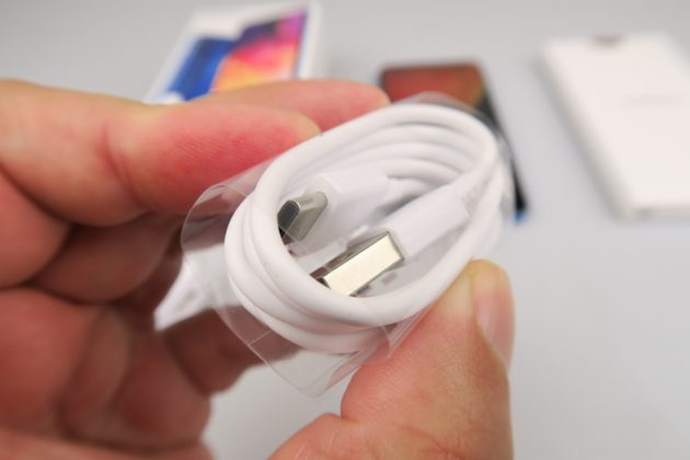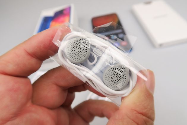 We’re dealing with a glossy and plasticky blue smartphone, launched in March 2019 and sporting a triple back camera, plus a fingerprint scanner within the display. Inside the box we find the manual and warranty stuck to the lid, just like the Galaxy S10 series. There’s also a metal key used to access the slots, an USB Type-C cable, manual and headphones.
