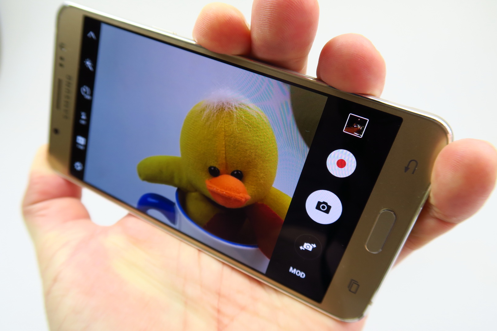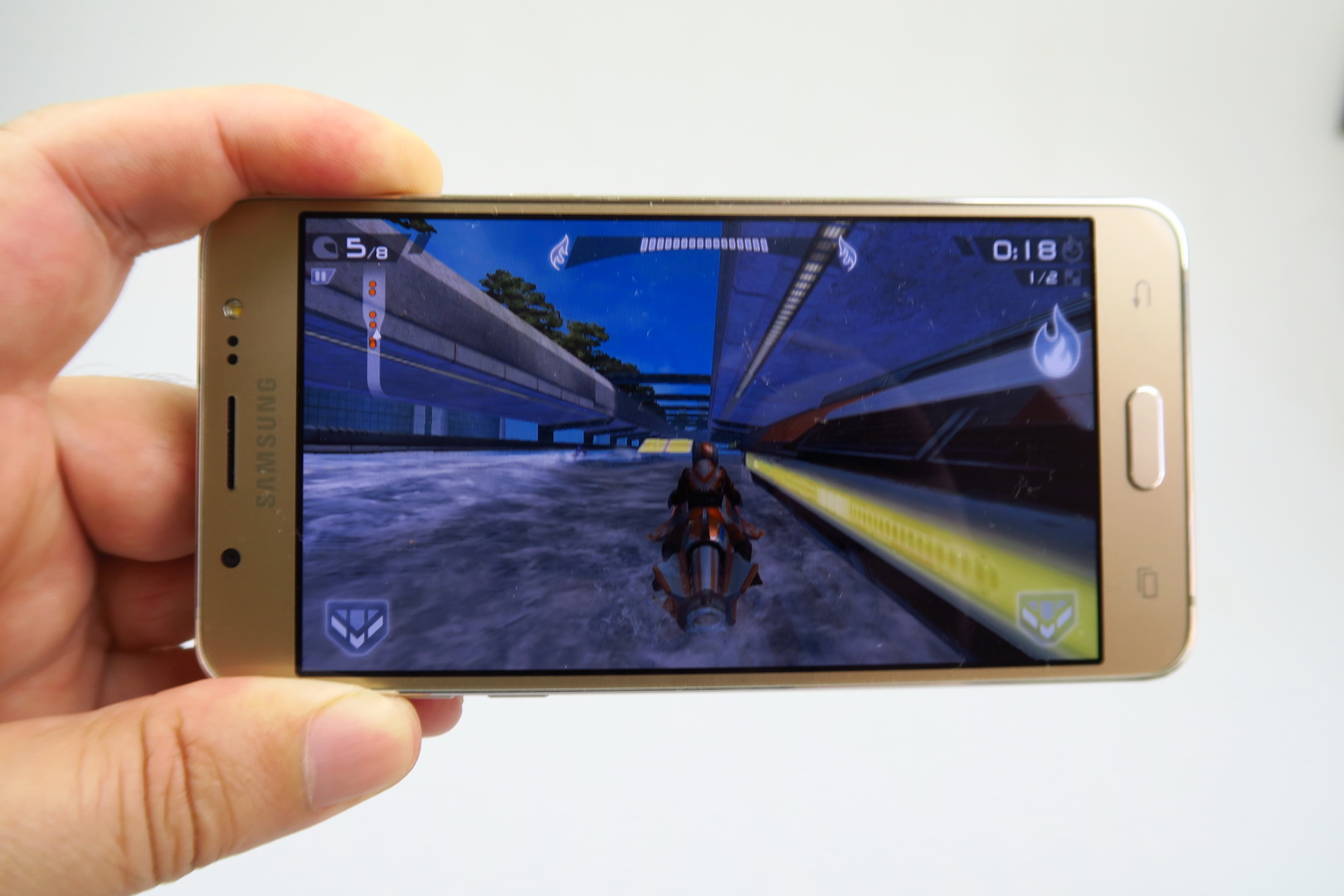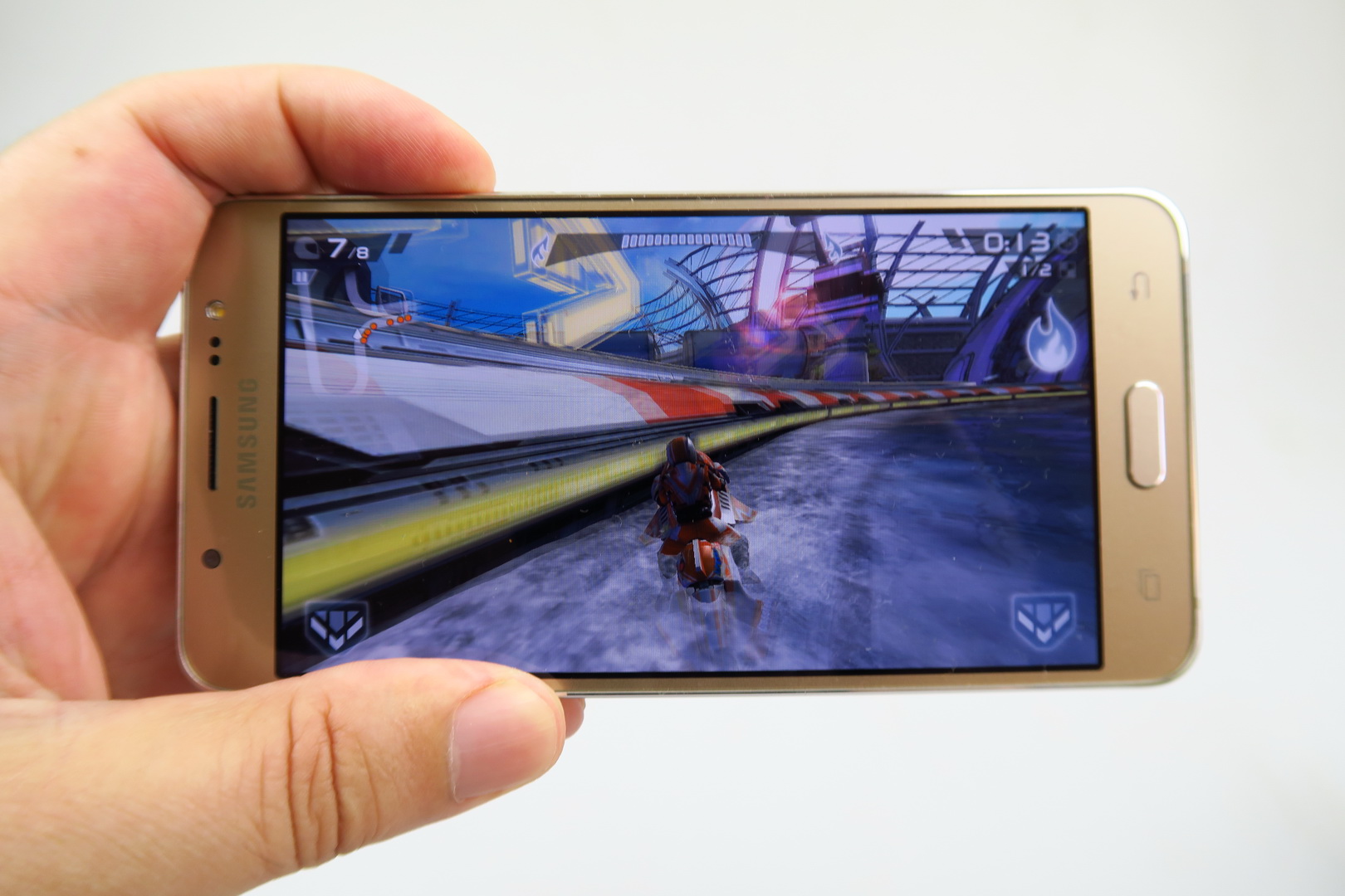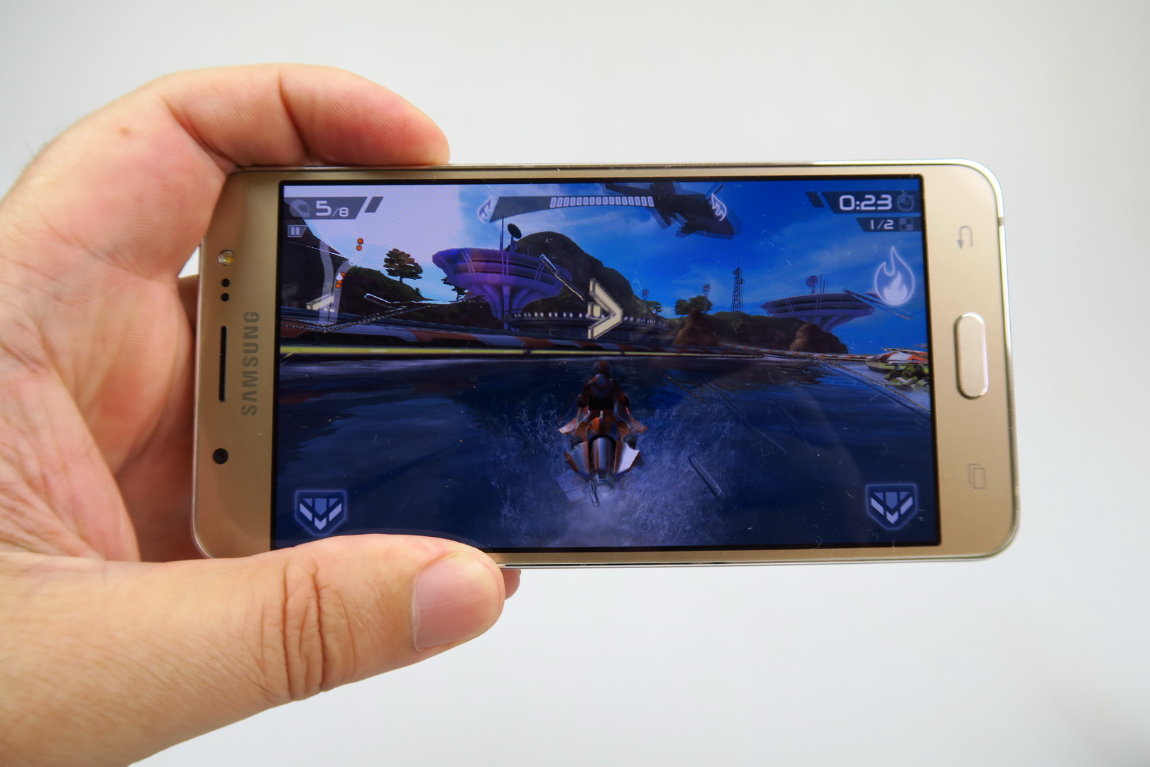 The display is quite good, but below the Galaxy A 2016, if you really want a comparison. As far as the CPU goes, we’ve got a quad core Snapdragon 410 here, the same chipset as the J5 before it. We get an Adreno 306 GPU, 2 GB of RAM, a 512 MB boost from the predecessor, 16 GB of storage and a microSD card slot. Apps fire up fast and there’s no lag, plus the UI is fluid.