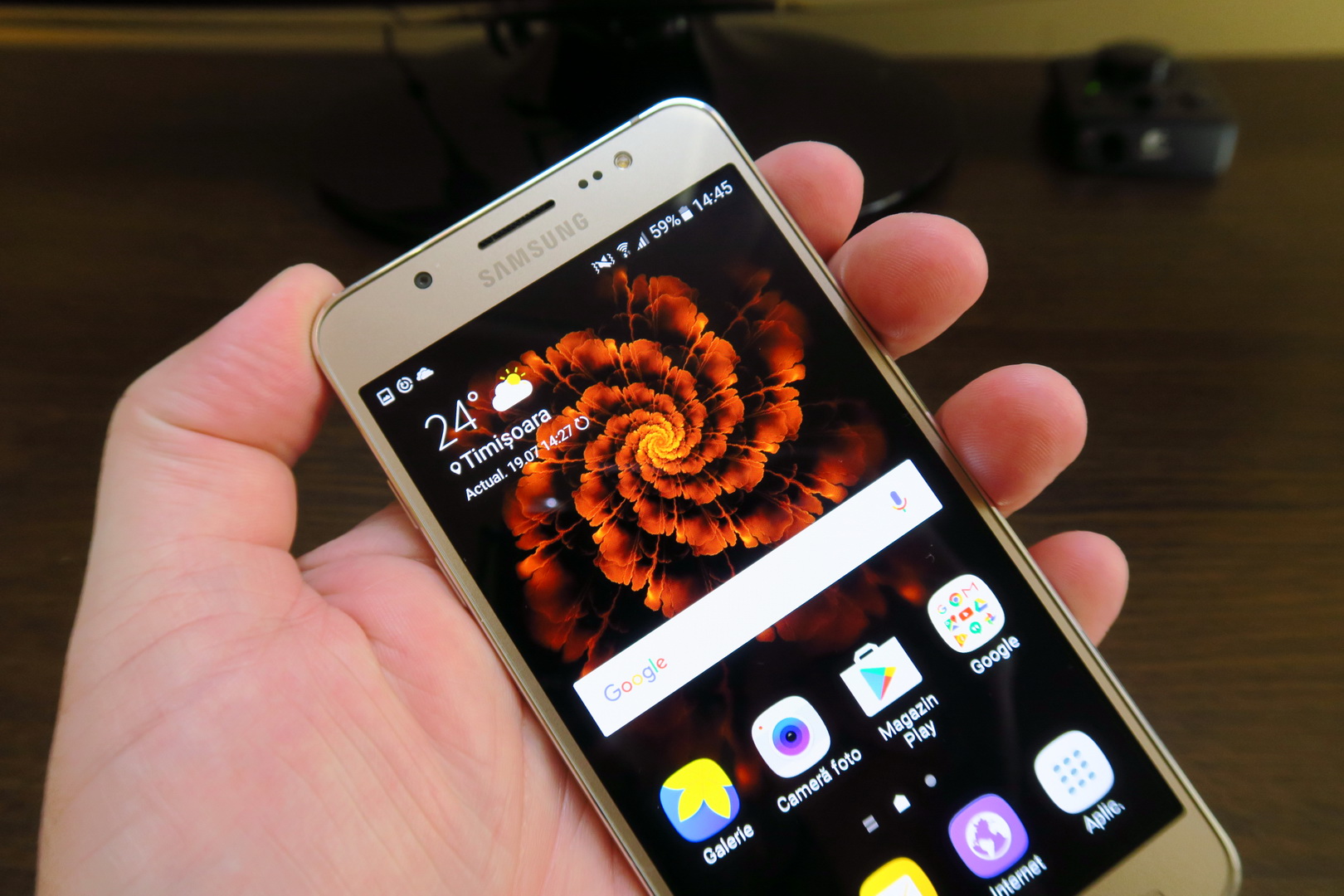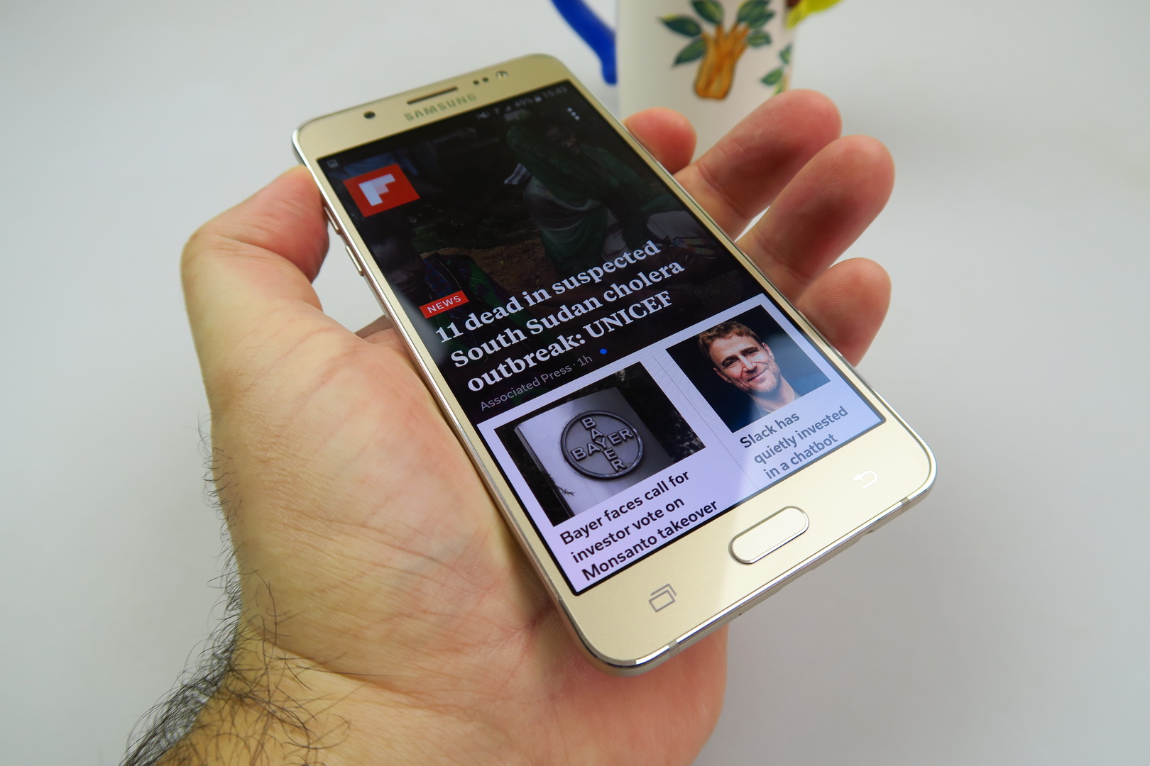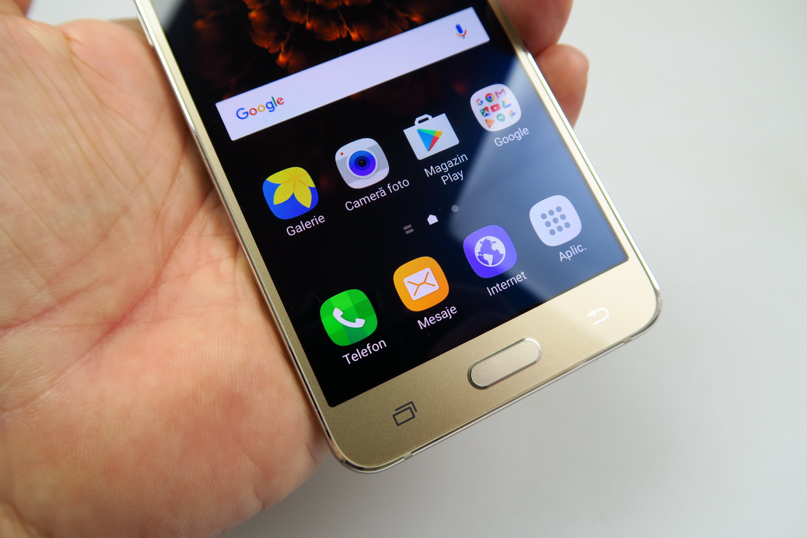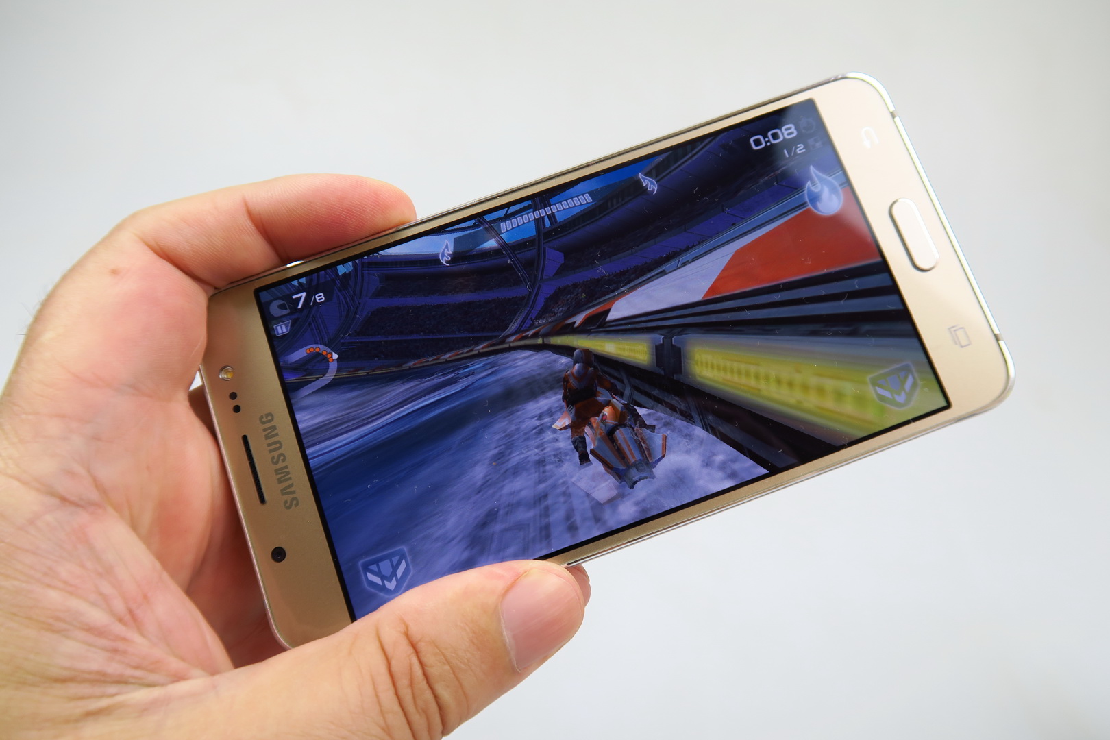 The display is quite good, but below the Galaxy A 2016, if you really want a comparison. As far as the CPU goes, we’ve got a quad core Snapdragon 410 here, the same chipset as the J5 before it. We get an Adreno 306 GPU, 2 GB of RAM, a 512 MB boost from the predecessor, 16 GB of storage and a microSD card slot. Apps fire up fast and there’s no lag, plus the UI is fluid.
