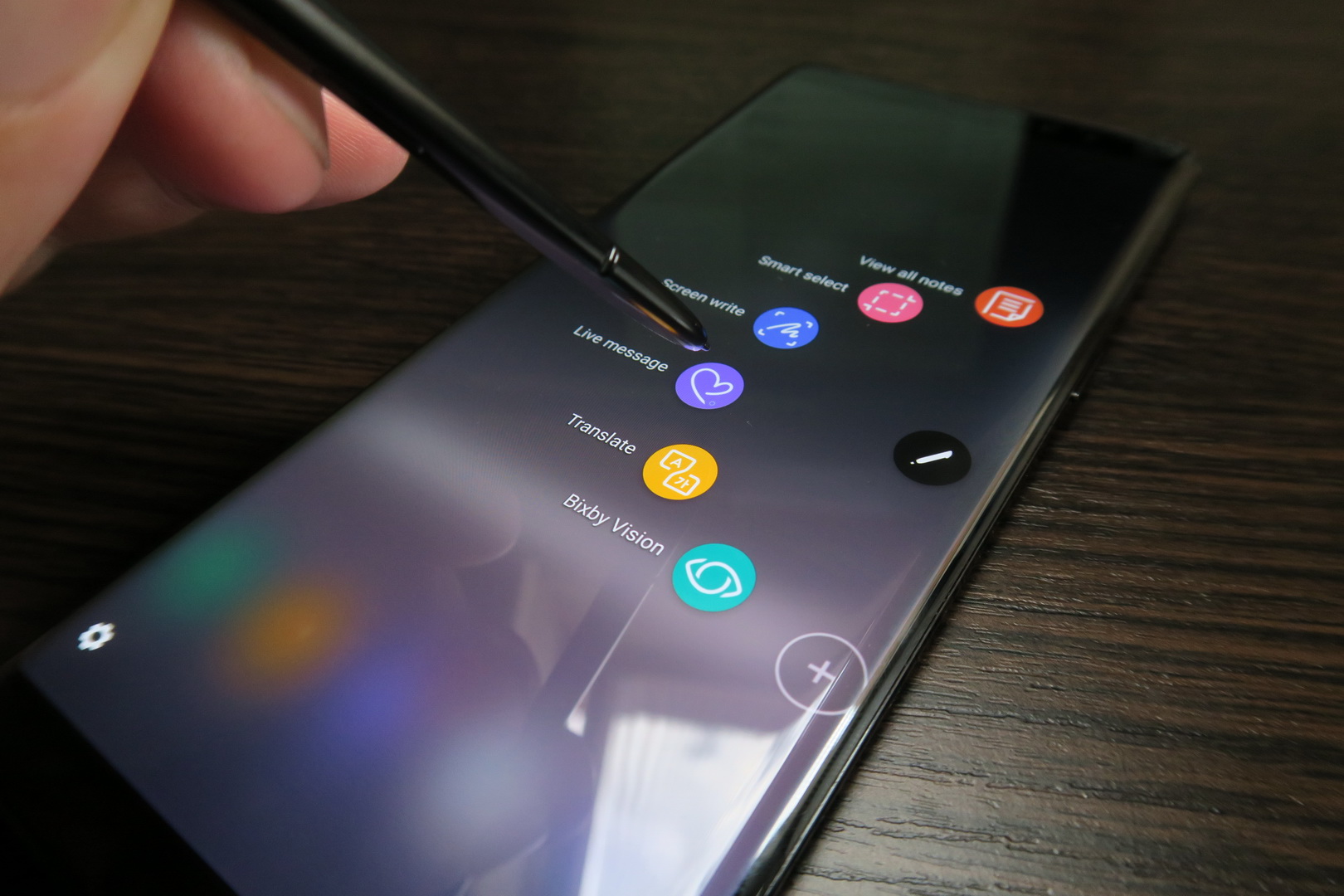 Edge shortcuts are still in the mix, shown on the device’s curved edges, as a series of vertical shortcuts. The whole UI and experience is 99% similar to the Galaxy S8. We also get split screen, carousel multitasking and the new and minimal Samsung experience. Keep the homescreen pressed and you access the widgets, wallpaper and grid/layout. It’s finally time to talk about the S-Pen, the brand new waterproof and dust proof stylus, that offers 4096 levels of pressure and has a clickable end. It lets you write on the standby screen and lets you take endless pages of notes on that area.
