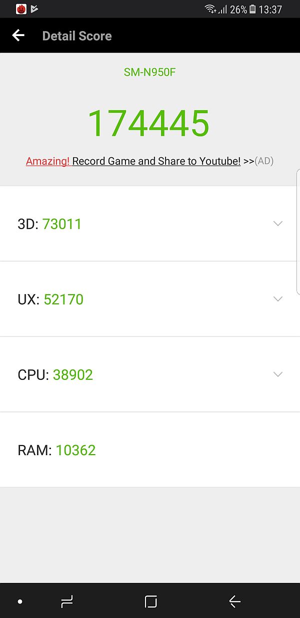 In 3DMark Slingshot Extreme we placed above Google Pixel XL and Huawei Mate 9, but also below the Galaxy S8 and Xiaomi Mi 6. Temperature-wise there was no problem, since we got to 38.2 degrees after running GFXBench and 34.3 degrees after playing Riptide GP Renegade, so there’s no overheating. Time to talk about the battery, a hot topic if we look at the previous Note.