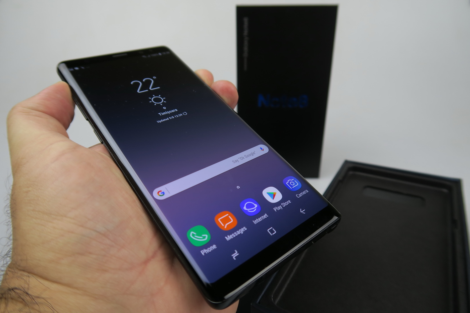 Once again, we are using the Exynos 8895 model and it’s a pretty hefty machine, at 195 grams in weight, which is 22 grams more than the Galaxy S8. At the same time it’s very narrow, which makes it easy to use with a single hand, a spectacular feat for a 6.3 incher. It measures 8.6 mm in thickness and our black unit immediately sucked all the prints and grease from my palms.