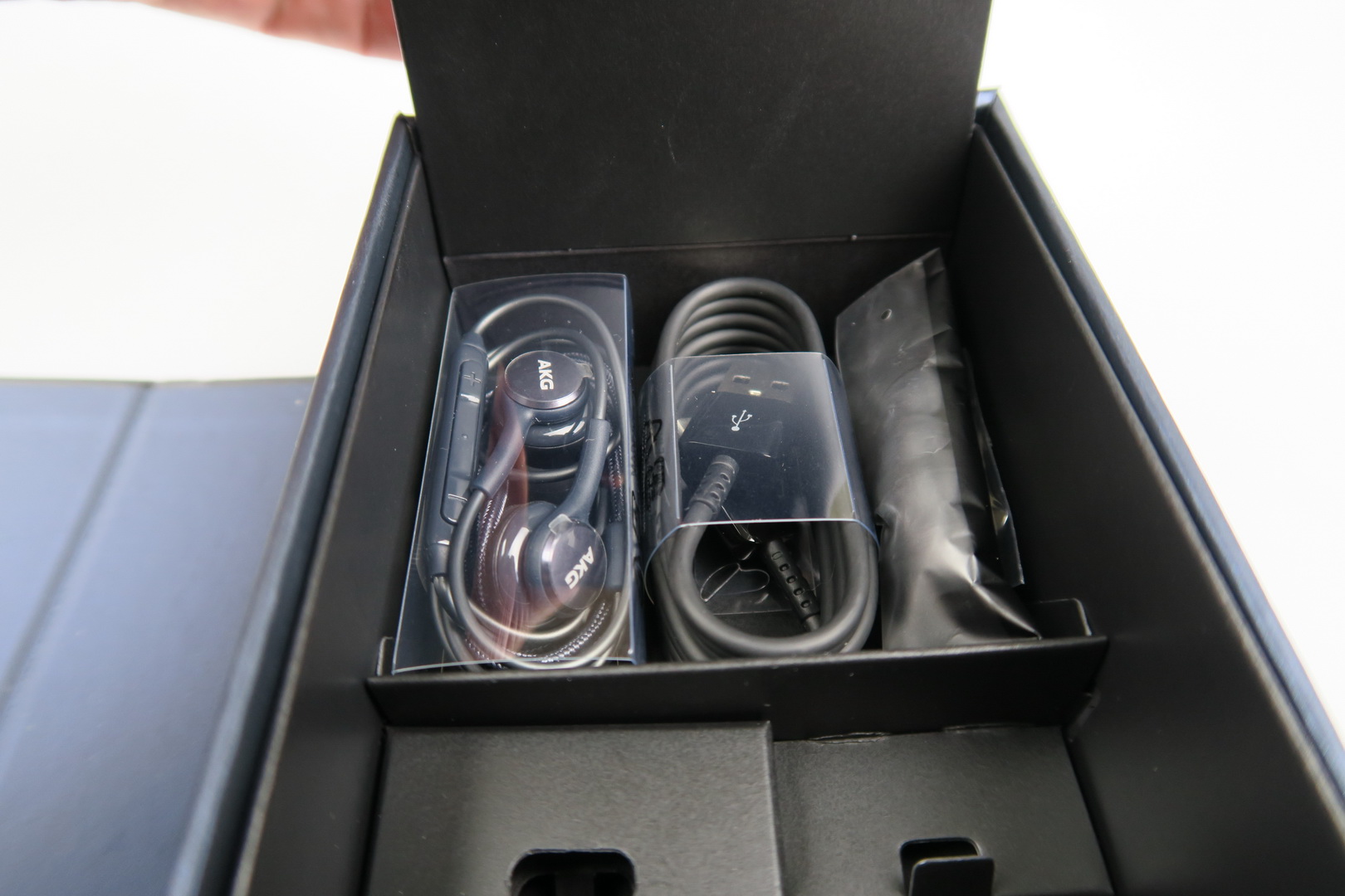 We have the black, 64 GB, dual SIM Exynos version of the smartphone, just in case you were wondering. Inside the box we find the AKG tuned headphones, special plugs for them, an Adaptive Fast Charging charger and USB Type-C cable. There’s also a manual, metal key and S-Pen nibs, plus a special mechanism to replace them. Finally Samsung throws in special USB Type-C to full USB and one to microUSB adapters, used to transfer data from your old device.