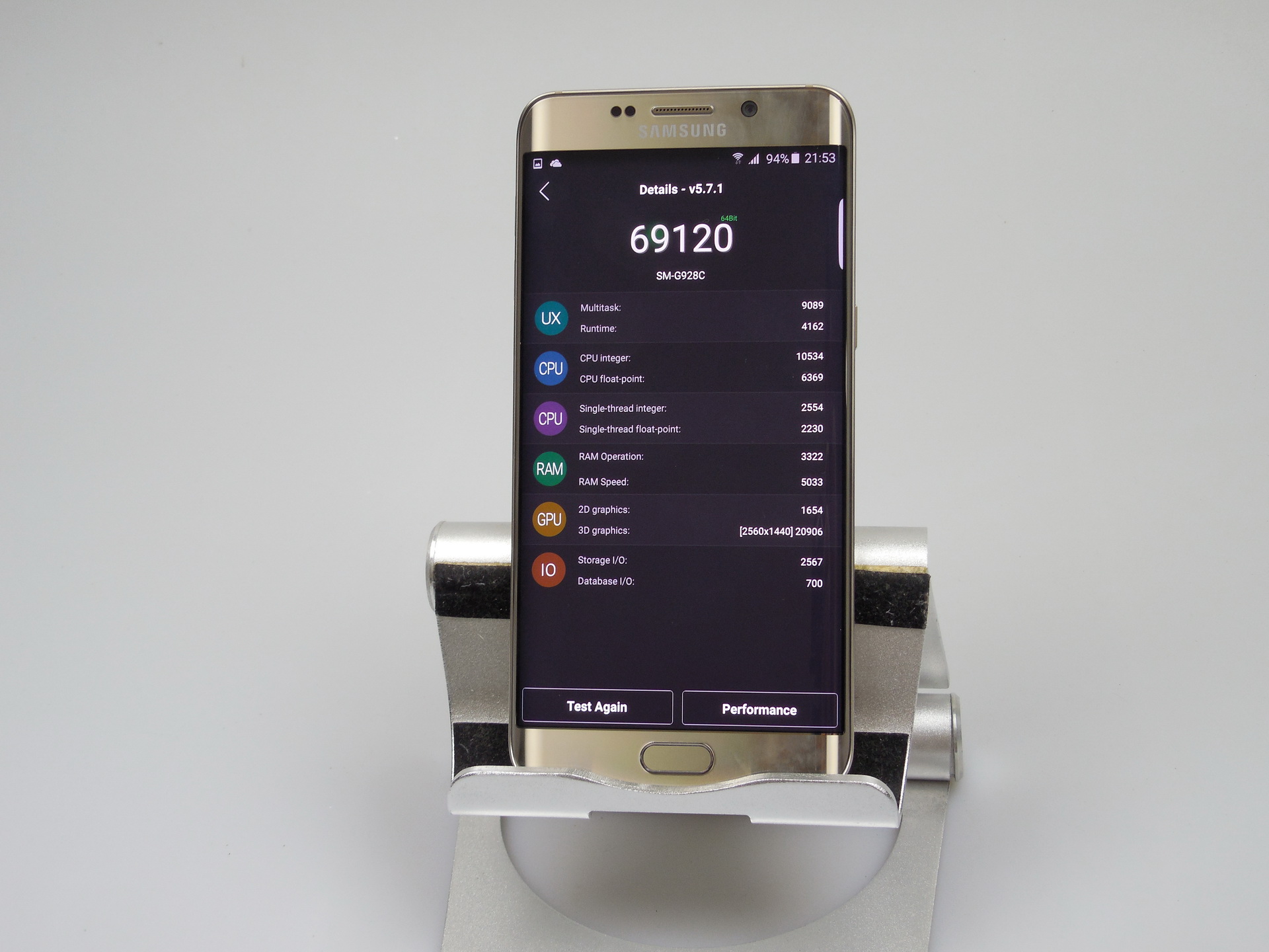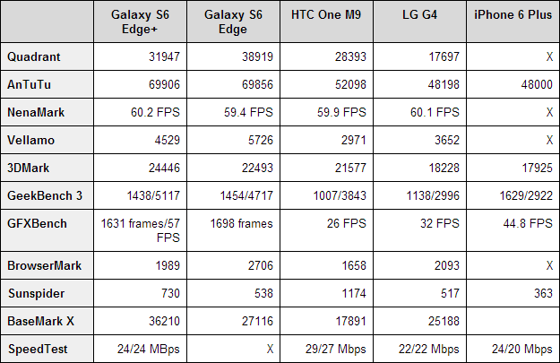 Now off to the benchmarks. We compared the Galaxy S6 Edge+ to the Galaxy S6 Edge, HTC One M9 and LG G4, as well as the iPhone 6 Plus. This is a battle of the Exynos 7420, Exynos 7420 again, Snapdragon 810, Snapdragon 808 and Apple A8. Here are the results: