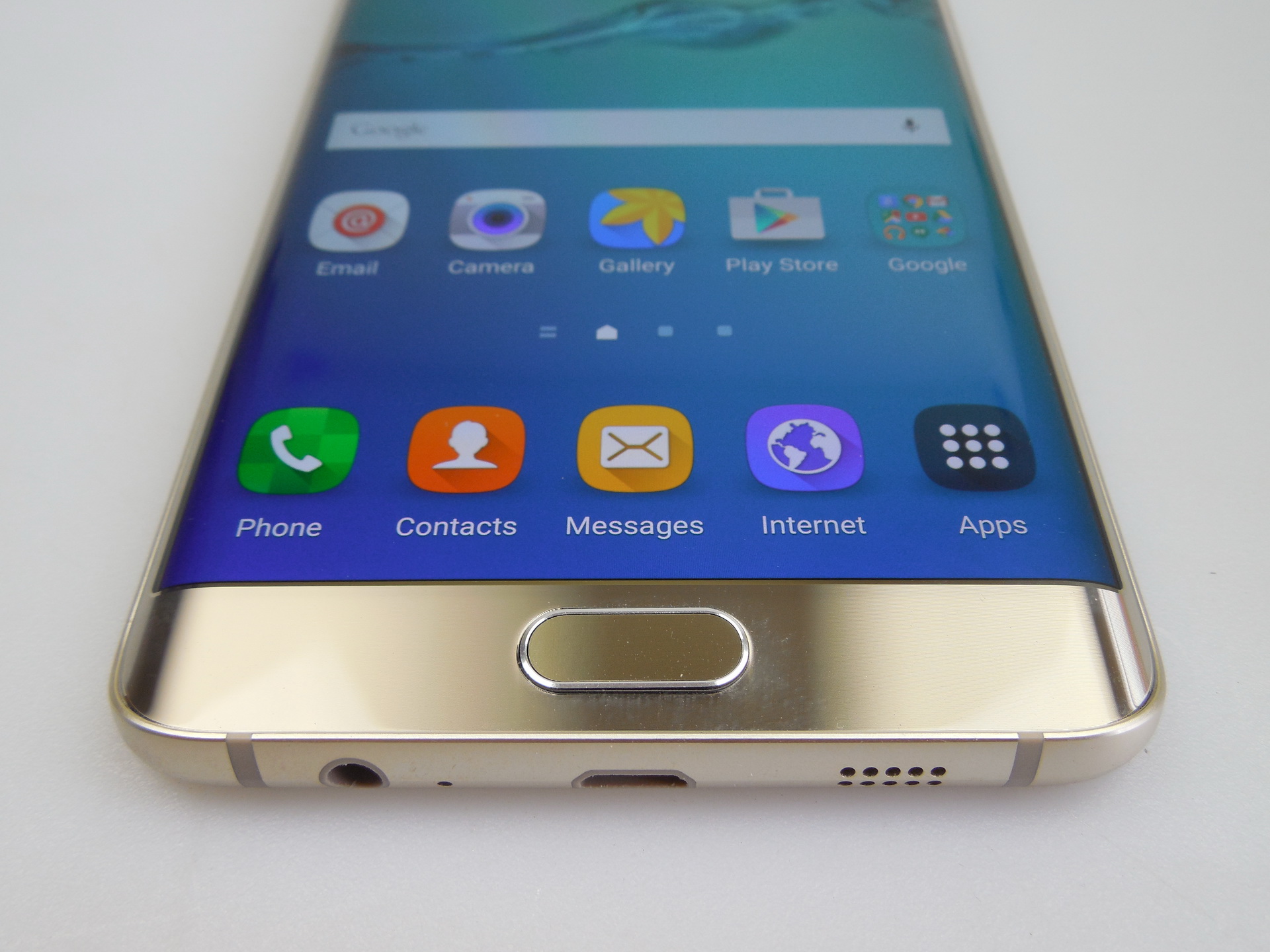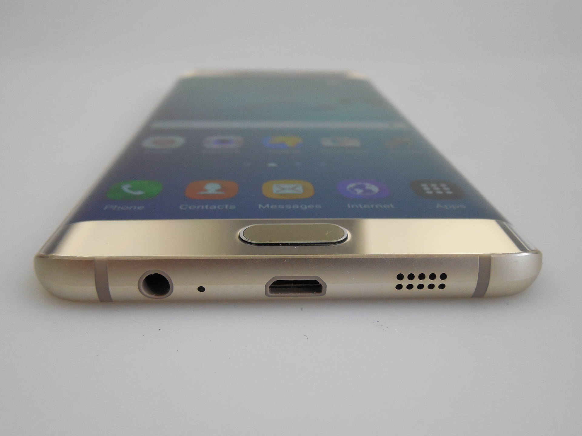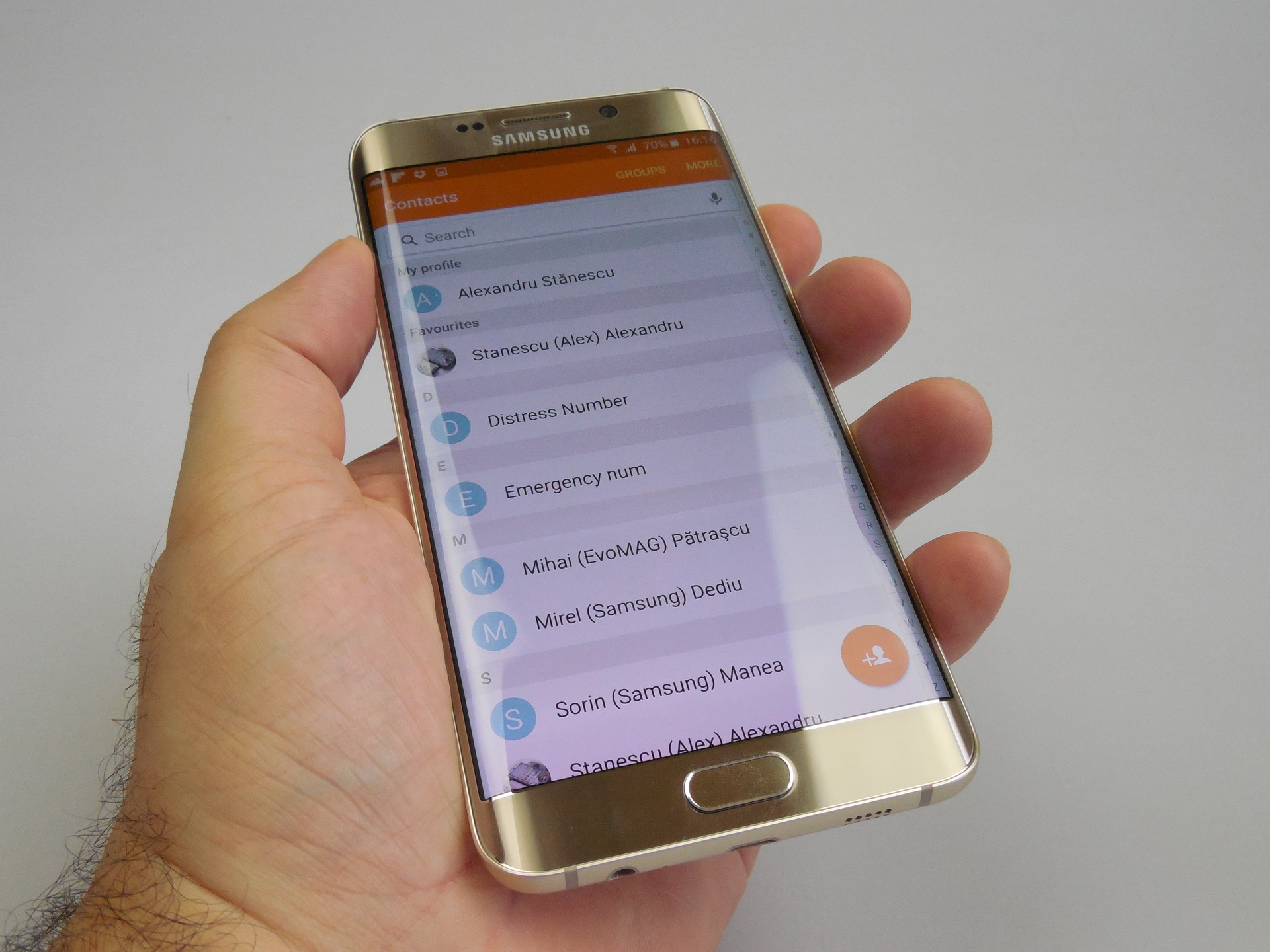 One hand usage is OK and the smartphone is made using 7000 Series aluminum, that’s 1.7 times stronger than regular aluminum and also 1.3 more scratch-proof than the same regular aluminum. Galaxy S6 Edge+ comes in gold, black, white or silver and upfront we find the earpiece, sensors, front camera, Home button with fingerprint scanner, notification LED, 2 capacitive buttons and gently curved edges.