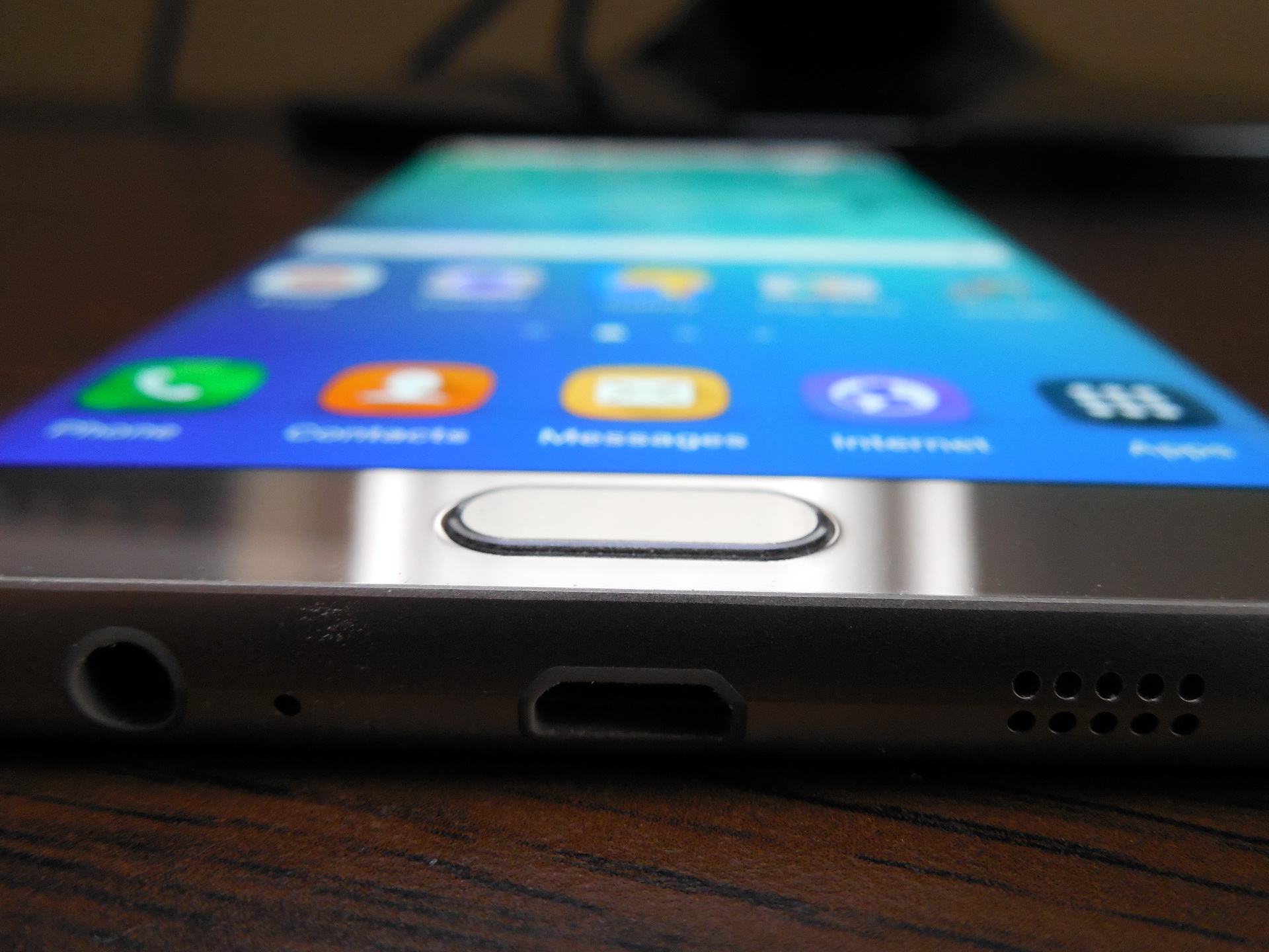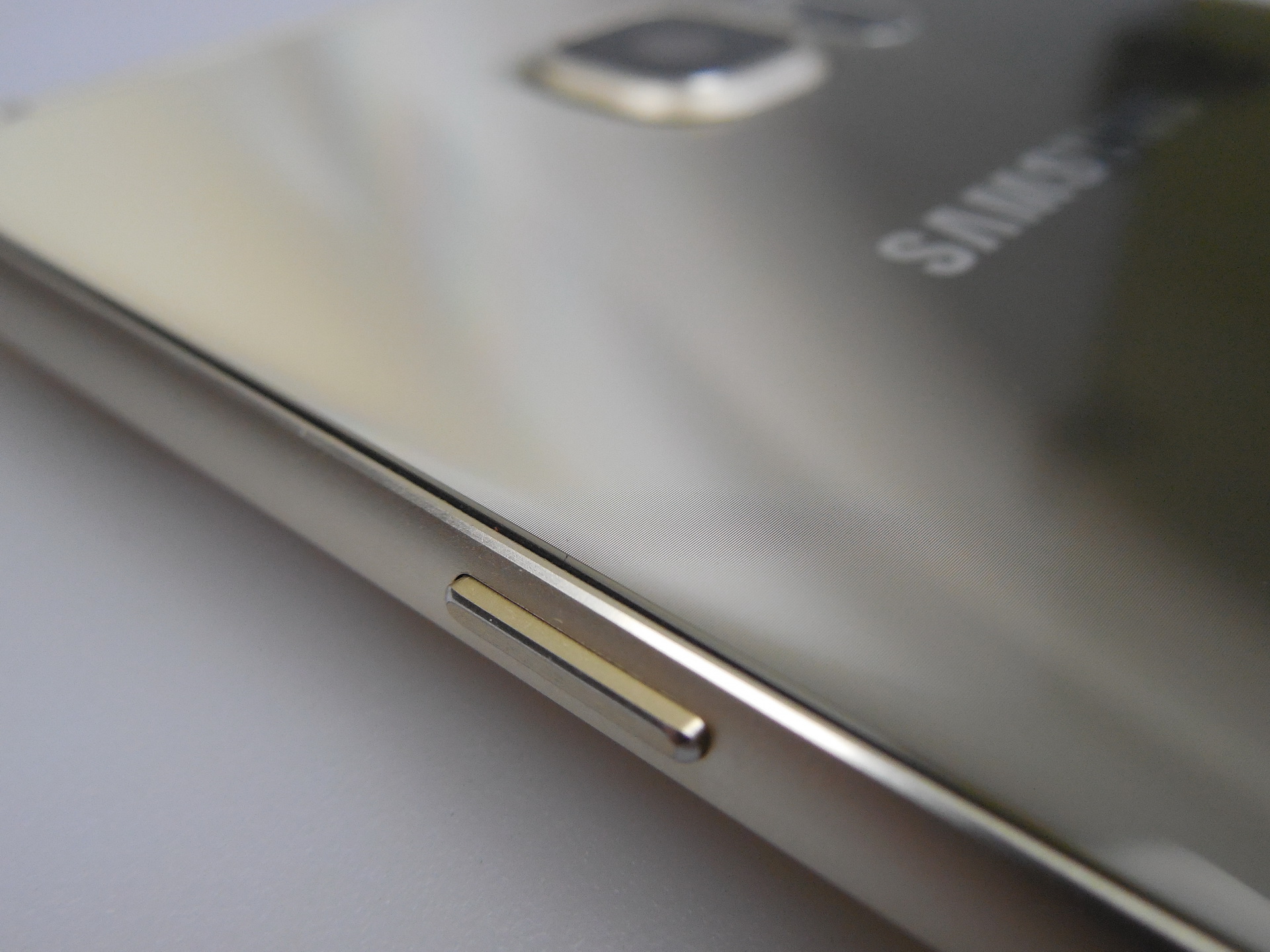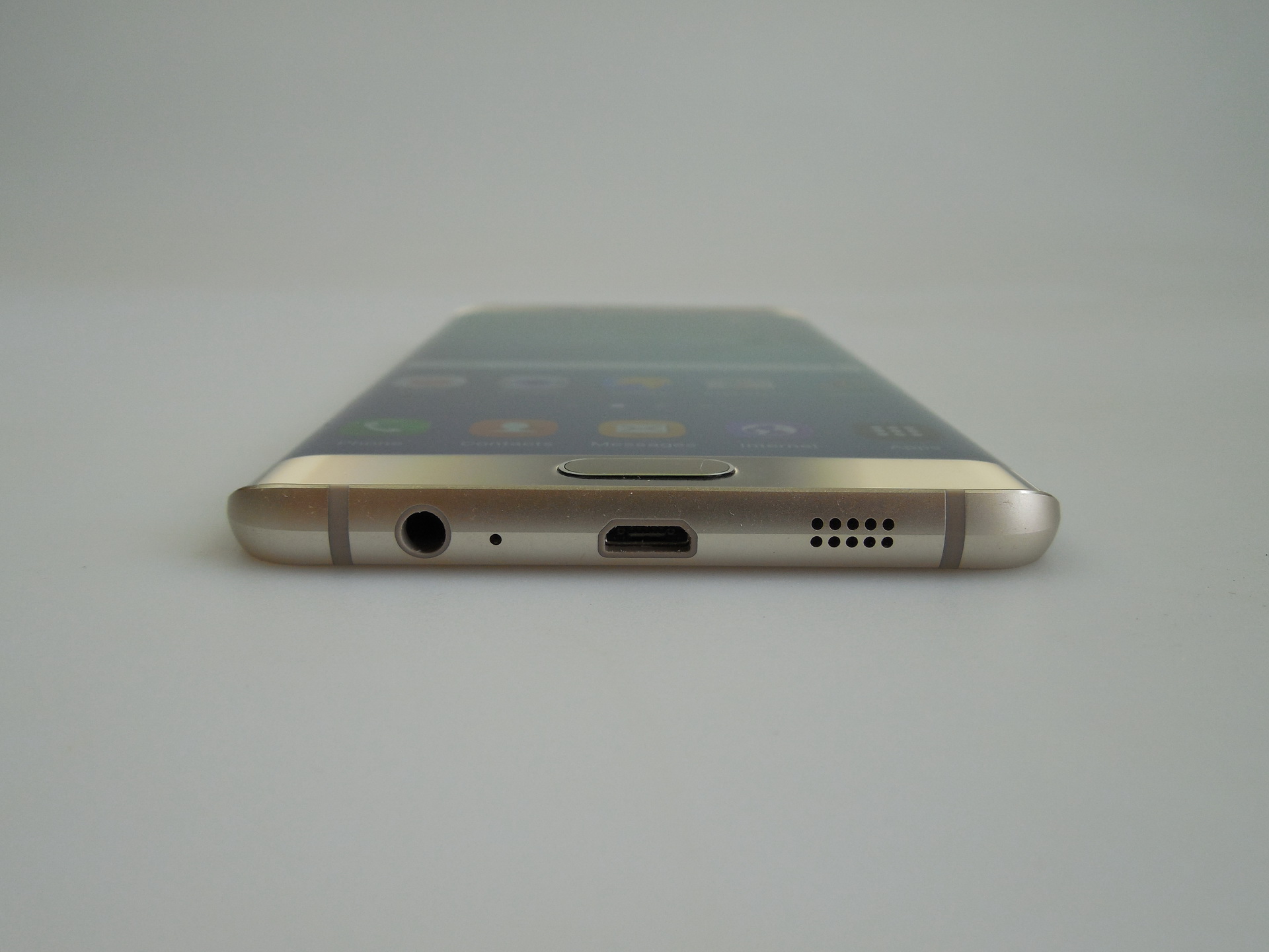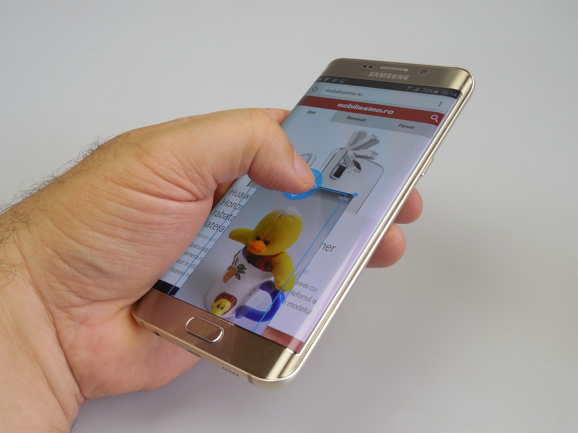 One hand usage is OK and the smartphone is made using 7000 Series aluminum, that’s 1.7 times stronger than regular aluminum and also 1.3 more scratch-proof than the same regular aluminum. Galaxy S6 Edge+ comes in gold, black, white or silver and upfront we find the earpiece, sensors, front camera, Home button with fingerprint scanner, notification LED, 2 capacitive buttons and gently curved edges.