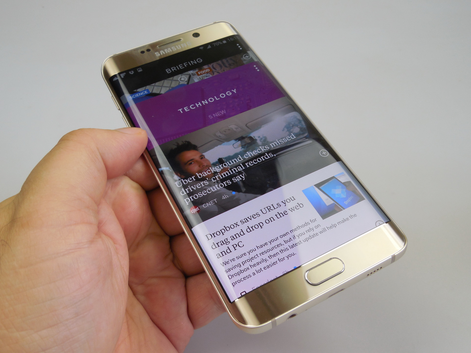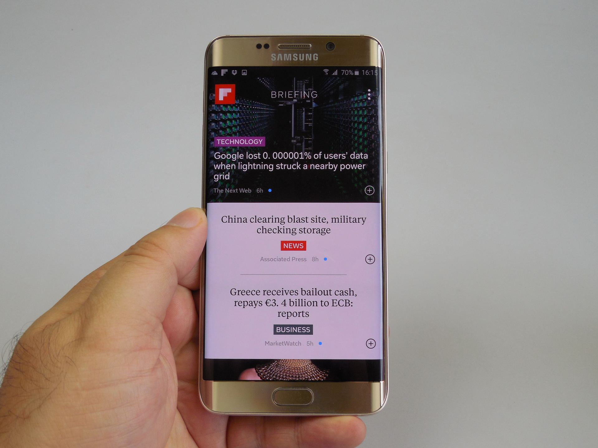 The info stream is still here, showing up in standby mode, on the curved edge, after being swiped for a few times. That one shows news from Yahoo, some notifications and the weather. The edge keeps all the functionality of the S6 Edge, but only adds the app list section. As with the Edge, once you put the device with the screen on a flat surface, you can see the color coded notification radiating from the sides once you get called or messaged.