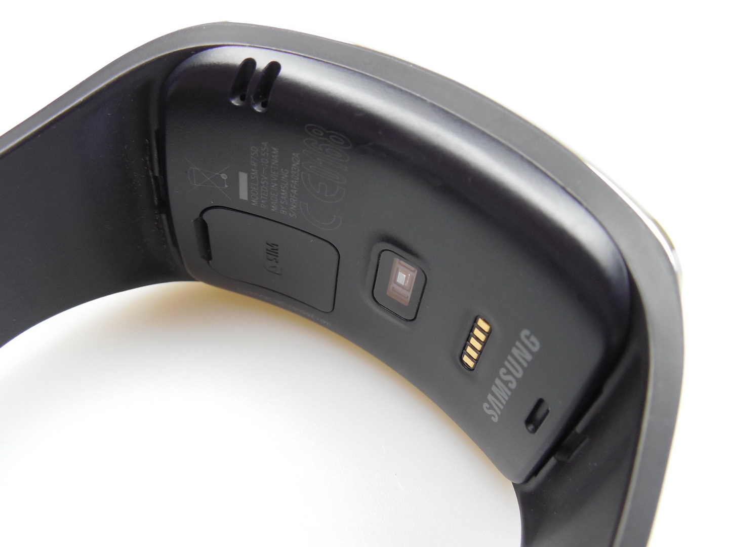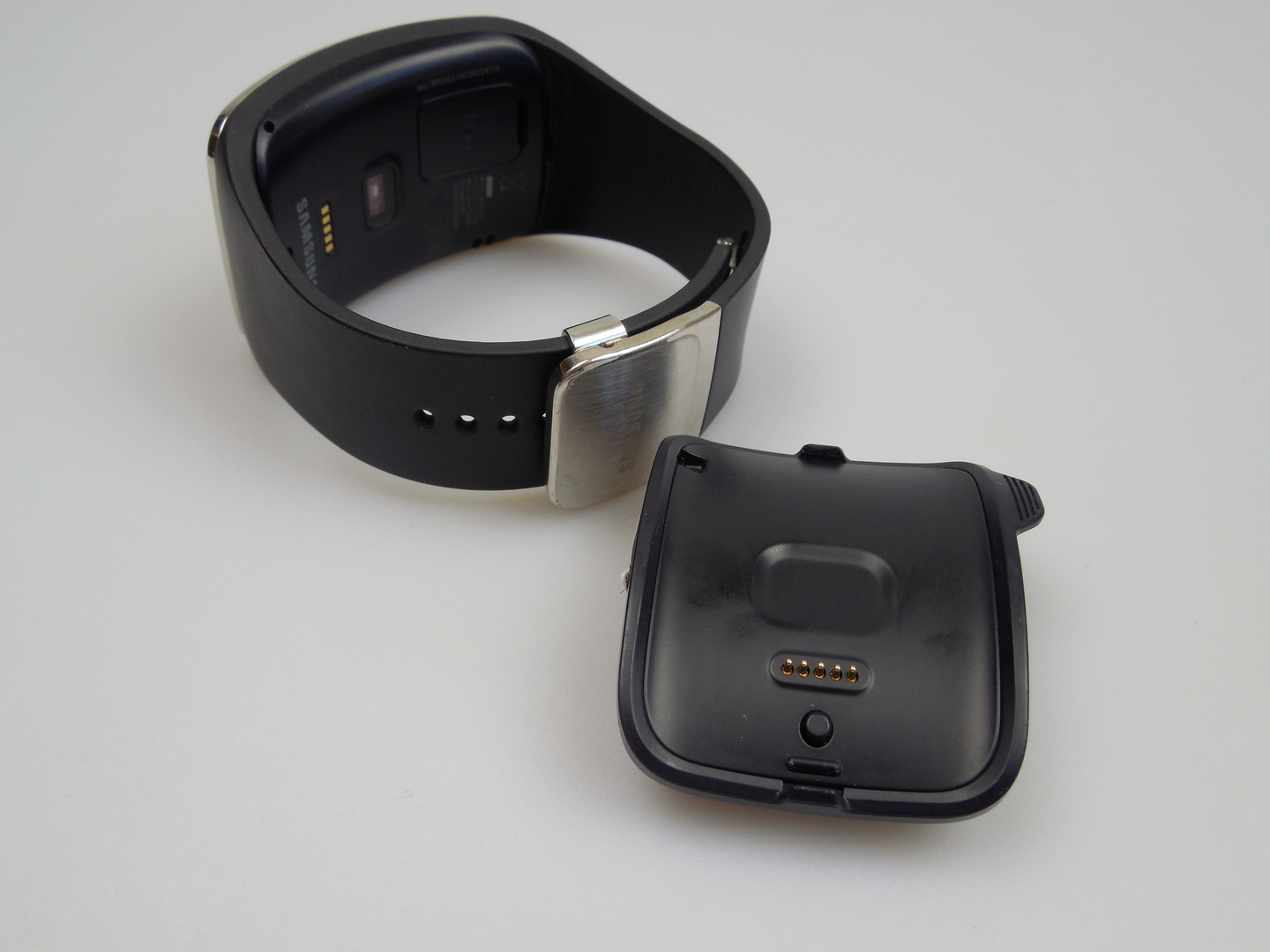 At the back we find speakers, a nano SIM card slot, that’s quite hard to prop open, unless you use long nails or a special tool. Also at the back there’s a heart rate sensor, charging pins and I have to mention that it’s quite hard to put on and remove the charging cradle. The watch is reasonably sturdy, but it’s quite big and its band will make you sweat.