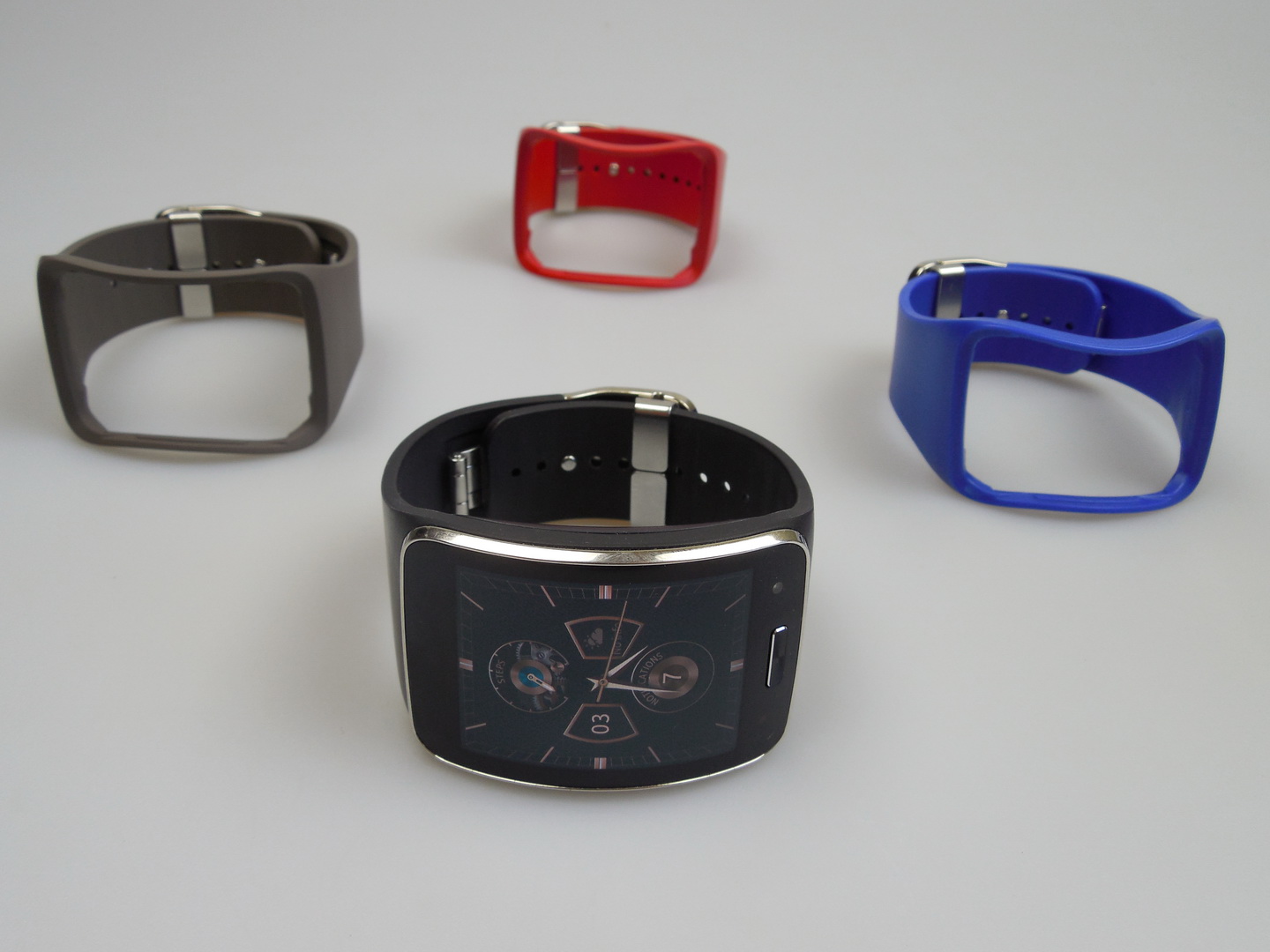 It’s priced at $350 on T-Mobile USA and it measures 12.5 mm in thickness. It weighs 67 grams, features a curved screen and it’s dust and water resistant, at up to 1 meter and 30 minutes. Gear S has a plastic body and comes bundled with a charging kit, that has an extra battery inside. We also had some extra straps for the watch, in red, blue and gray.