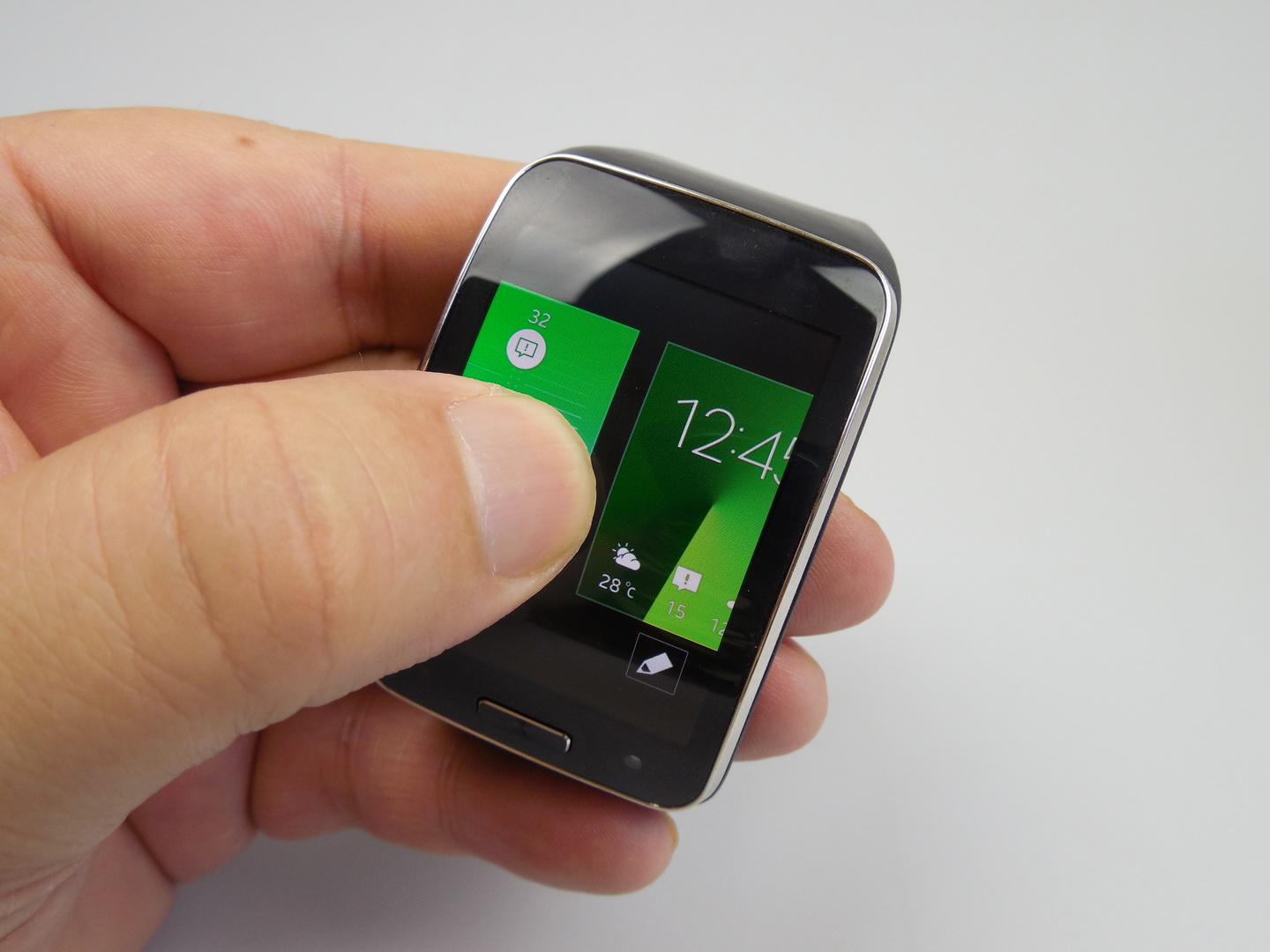 You will certainly not go unnoticed if you wear this watch, that’s more of a mini phone. Still, it’s reasonably comfy. On the hardware side, we get a curved Super AMOLED 2 inch screen, with a 360 x 480 pixel resolution, as well as a dual core Snapdragon 400 CPU, clocked at 1 GHz. There are 512 MB of RAM inside, a microphone, 4 GB of storage and as far as connectivity goes, there’s Bluetooth 4.1, WiFi b/g/n, 3G, AGPS, Glonass and microUSB 2.0.
