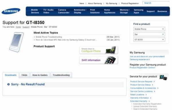 Also, this supposed Omnia 7 successor comes with a 800 x 480 pixel screen, the standard resolution for WP7. Bluetooth 2.1 and HSPA+ are also confirmed among the specs, in case you’re wondering. Extra info might be available soon from the now blank GT-i8350 page published by Samsung UK in the support database.