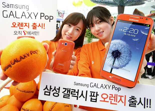 Samsung has unveiled a new color version of the Galaxy Pop in South Korea, that you can admire below. Aside from the white and grey version of the phone, we’ve got the Galaxy Pop in orange and the promotion involves some oranges to make the color more vibrant.