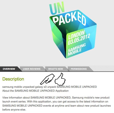 Samsung may have unveiled way too little in yesterday’s teaser, but there’s some interesting info to learn from its Unpacked Mobile 2012 app. This one you can download from Google Play and as you can see it includes the Galaxy S3 as codename, so this is pretty clear on what product we’ll see on May 3rd.