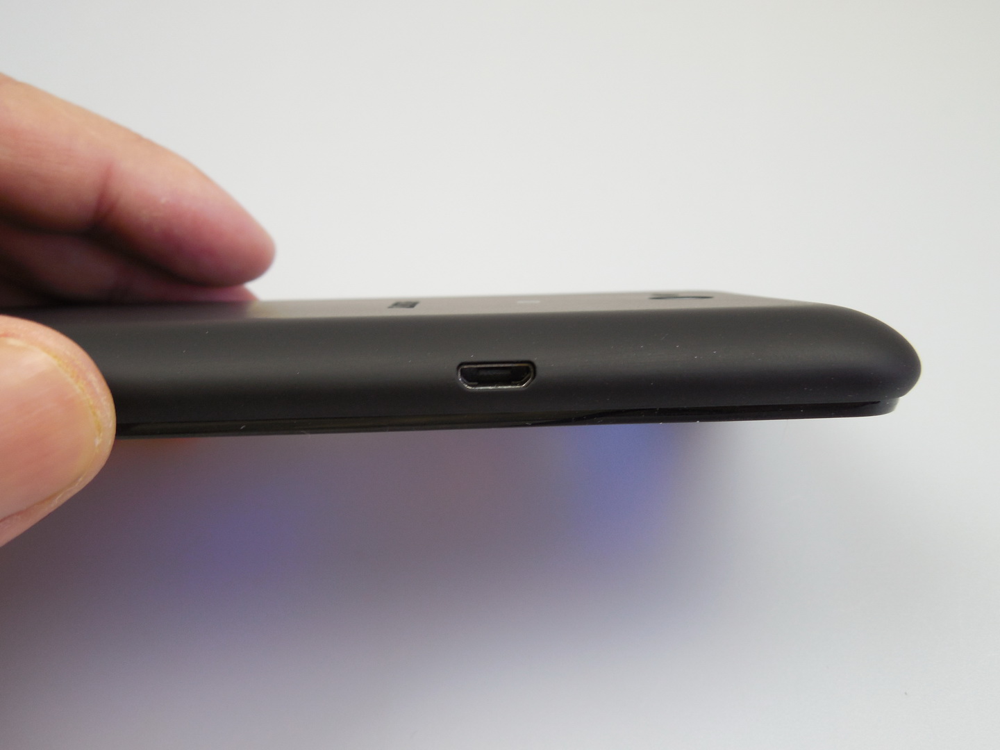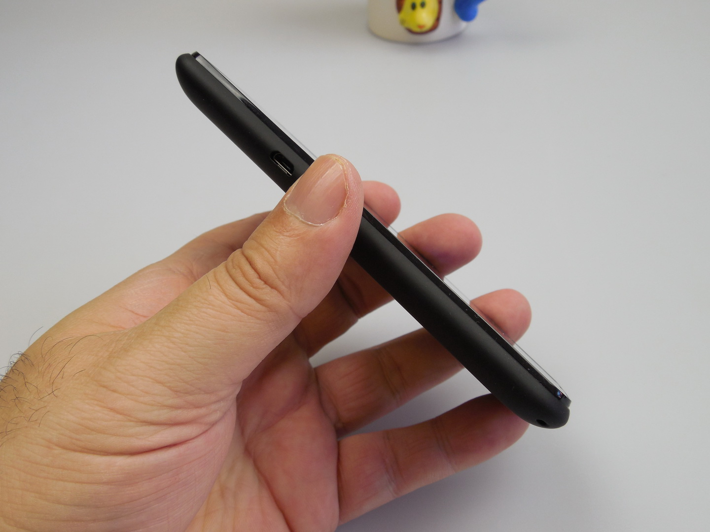 The smartphone weighs 135 grams, which is less than the 144 grams of the E4. I should also mention that the LTE phone is 3 mm narrower than the predecessor. The back cover is still a wraparound one, that also covers the edges. Once removed it shows a non removable battery, a microSD card slot and the SIM slot. This model has a solid build and at the back we find the main camera, flash and microphone, plus the speaker.