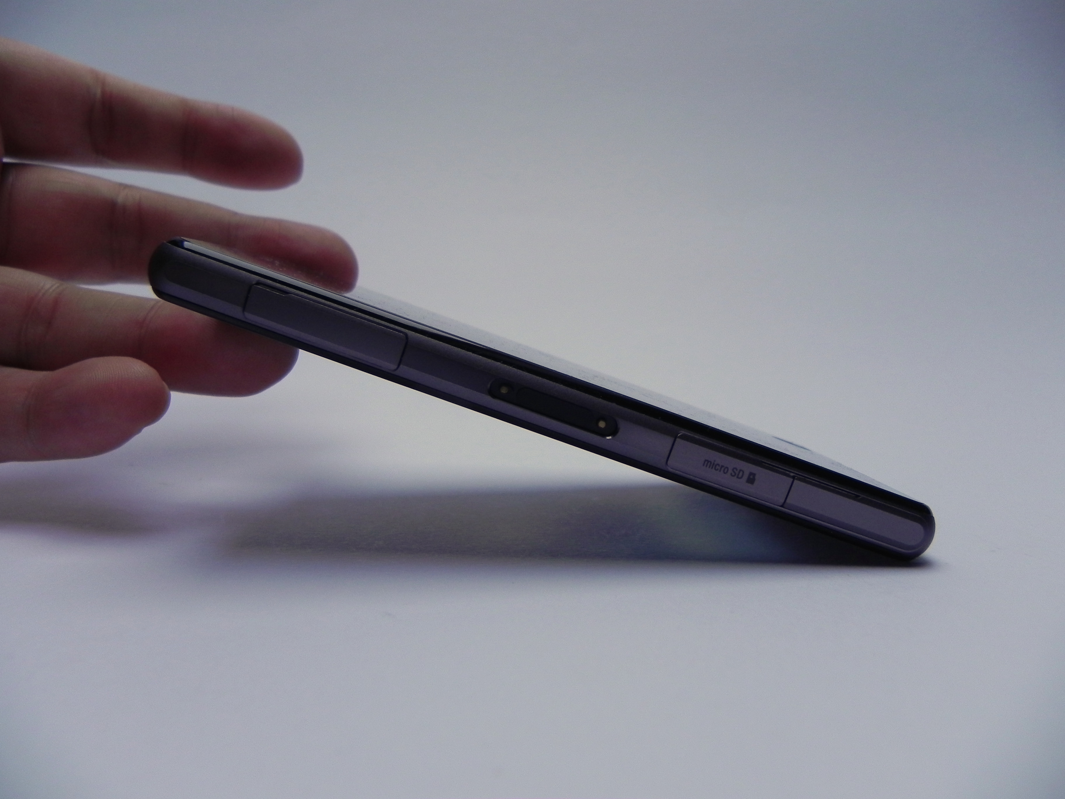 This model is actually less slippery than the Z1, simply because you can grasp it easily with your hand. It uses the same Omnibalance design as the last gen Xperias and relies on an aluminum frame to keep everything solid. The ports and slots are all on one side this time, while on the Z1, the microSIM was on the opposite side of the microSD and microUSB.