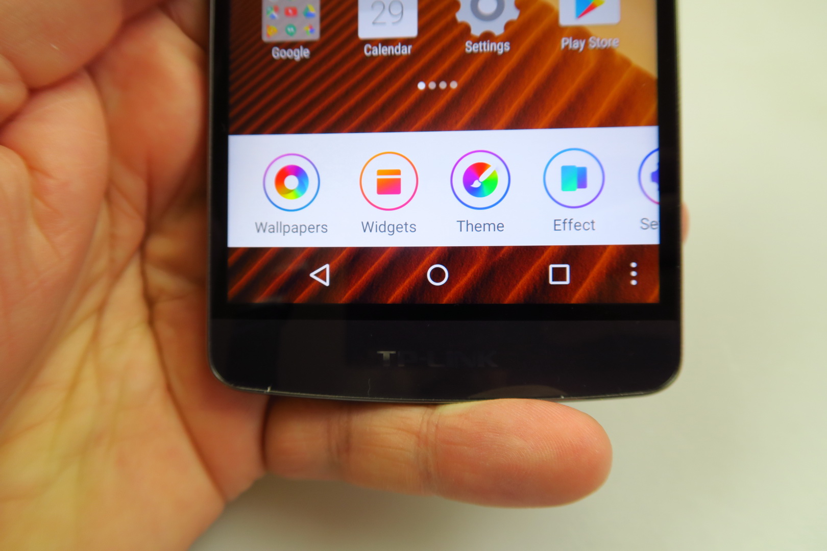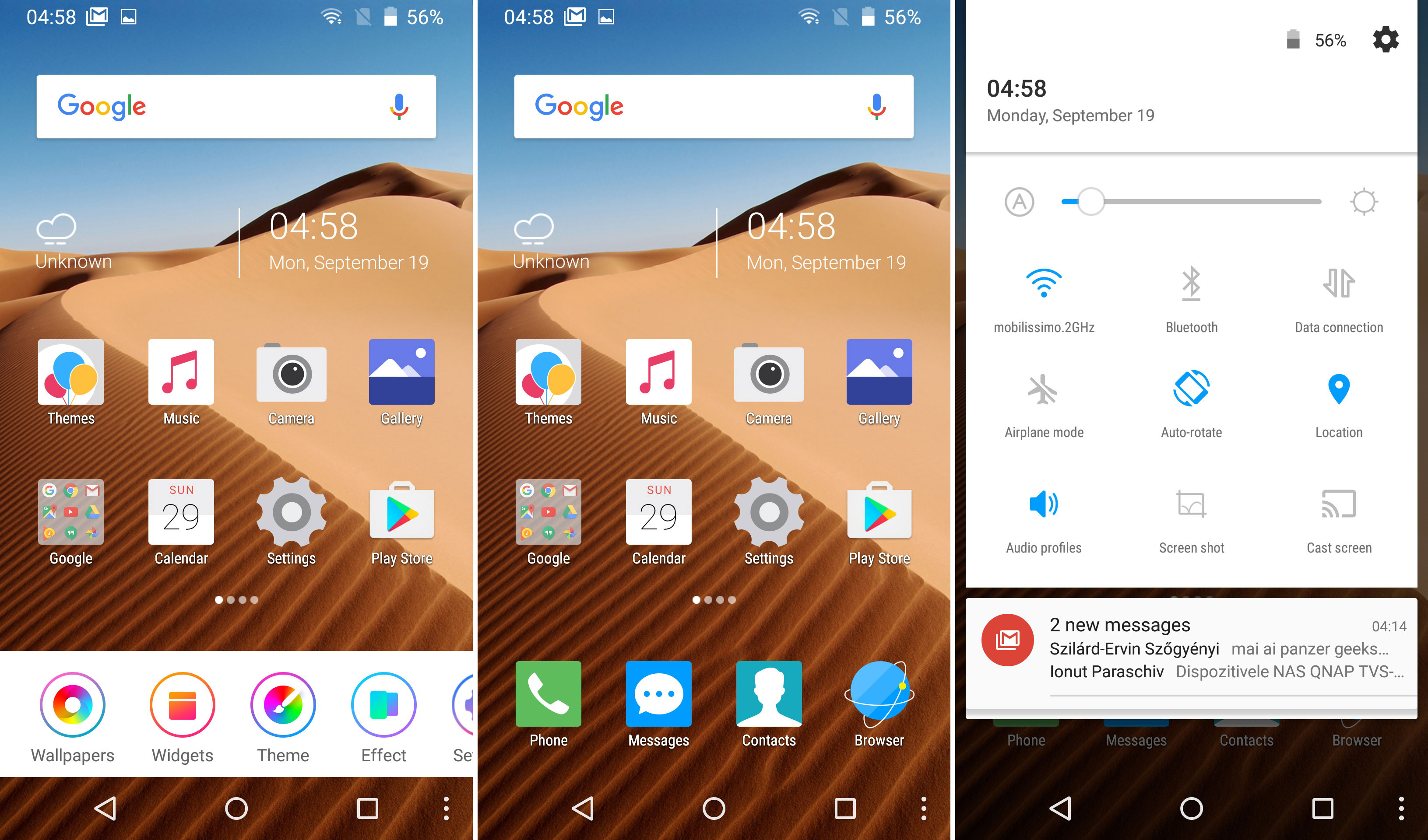 Multitasking relies on a carousel and a cleaner and interestingly we also get a fourth virtual button at the bottom of the screen, that triggers the wallpapers, widgets and themes area, plus effects and settings. Widgets are stock ones and we also get online themes and the option to auto group apps, which can be useful if you have a lot installed.