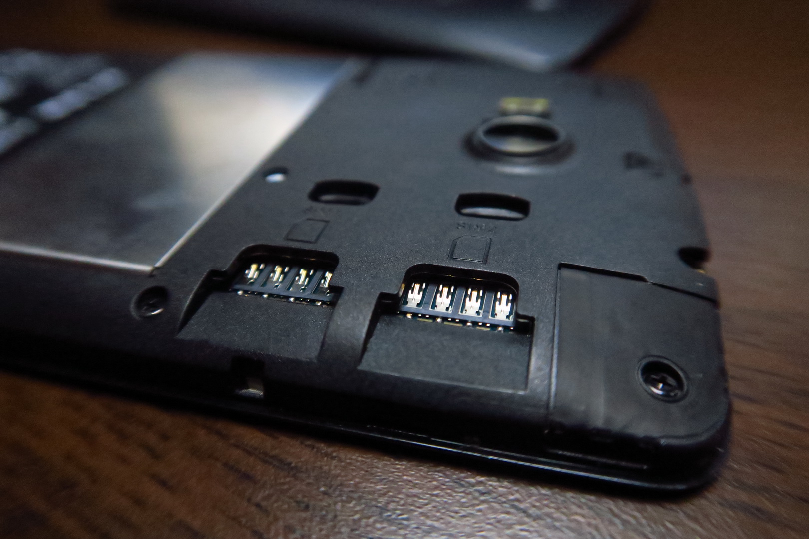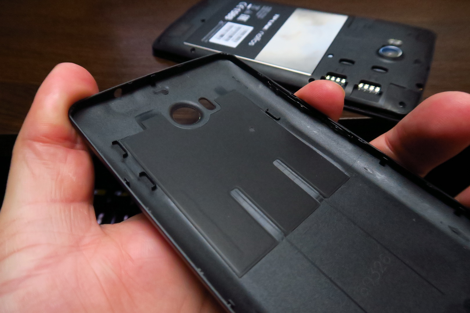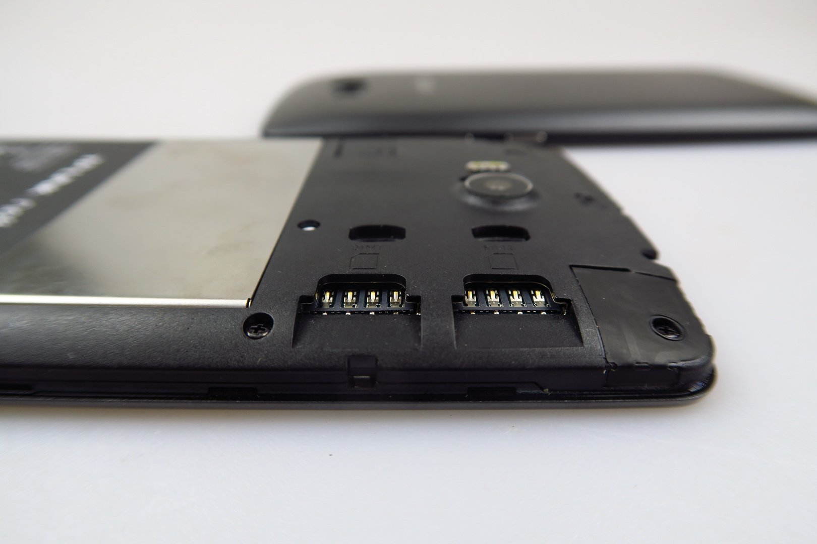 The back reminds me of a lower end Lumia and we actually get a removable back cover here, that feels kind of flimsy. The battery is non removable and also in the same area we find the microSD card slot and the two SIM slots. The build is quite OK and I noticed a glitter pattern below the screen in the front logo area. The grip is good and the handset is available in pearl white or dark gray.