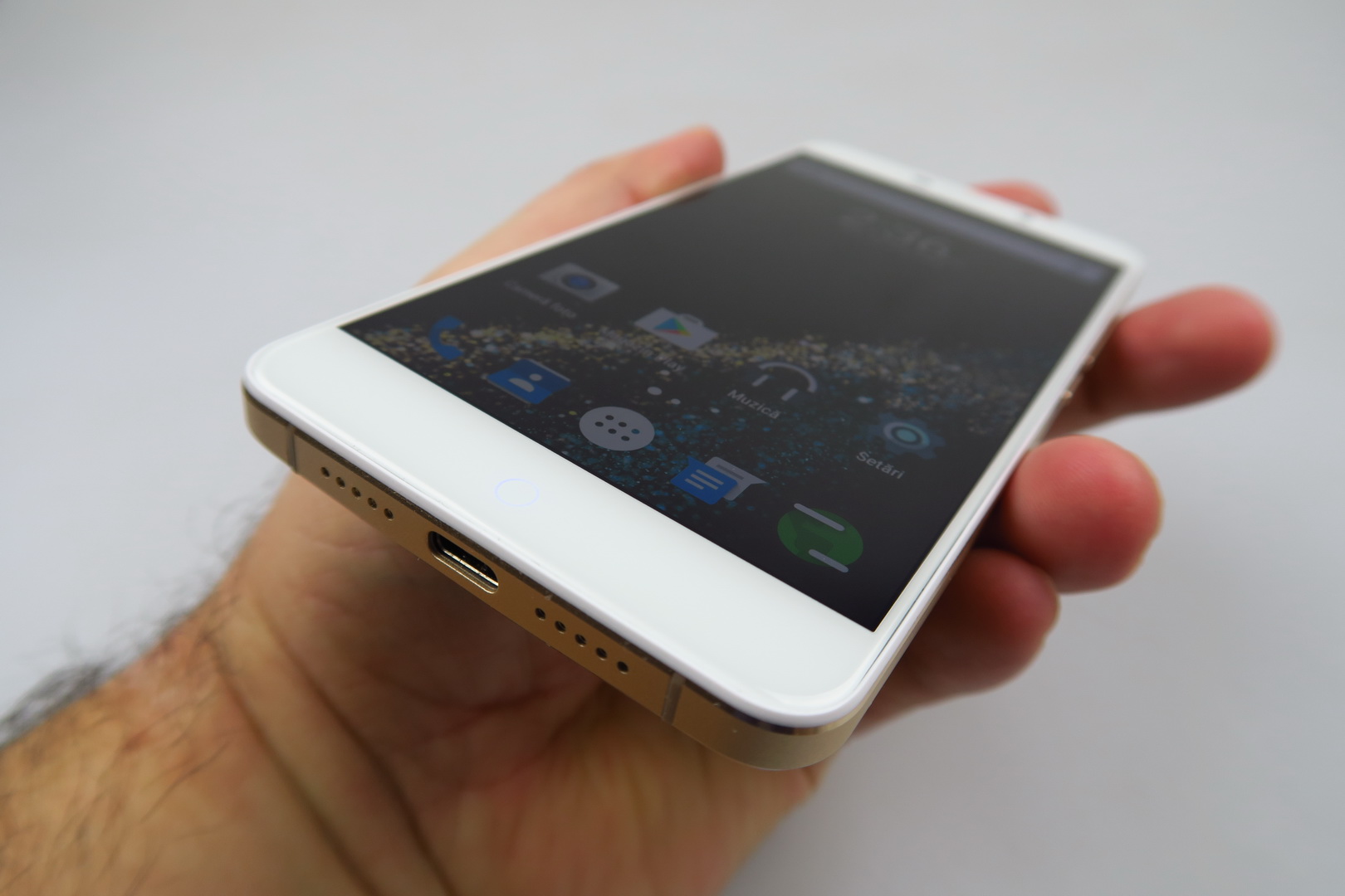 This is a 5.5 incher with a metal body and inside its box there’s a charger, USB Type C cable, metal key and manual. Launched last summer, the device came in a pretty beaten down box, which we’re sorry for, but it’s the fault of the transportation. The handset sports a metal body, that relies on magnesium and aluminum. Its specs include a 5.5 inch Full HD screen with a Sharp panel and the standout point of the design is a Home button with a multi color LED included.
