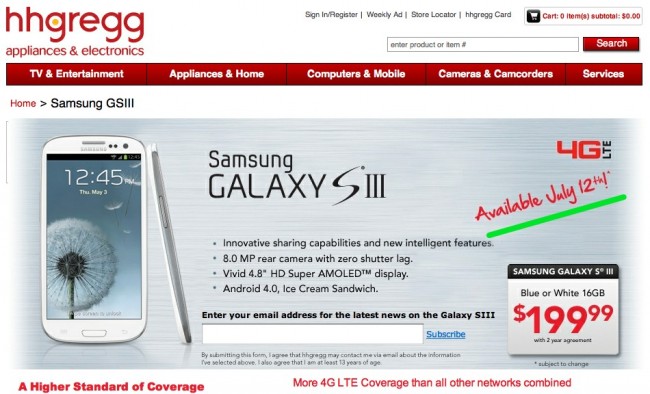 After some turnmoil and unexplainable delays, the Samsung Galaxy S III finally gets an actual release date on Verizon, for USA. Retailer HHGregg lists the product as coming on July 12th, with a price tag of $199.99, in either blue or white. This price applies to the 16GB version, in case you’re wondering.