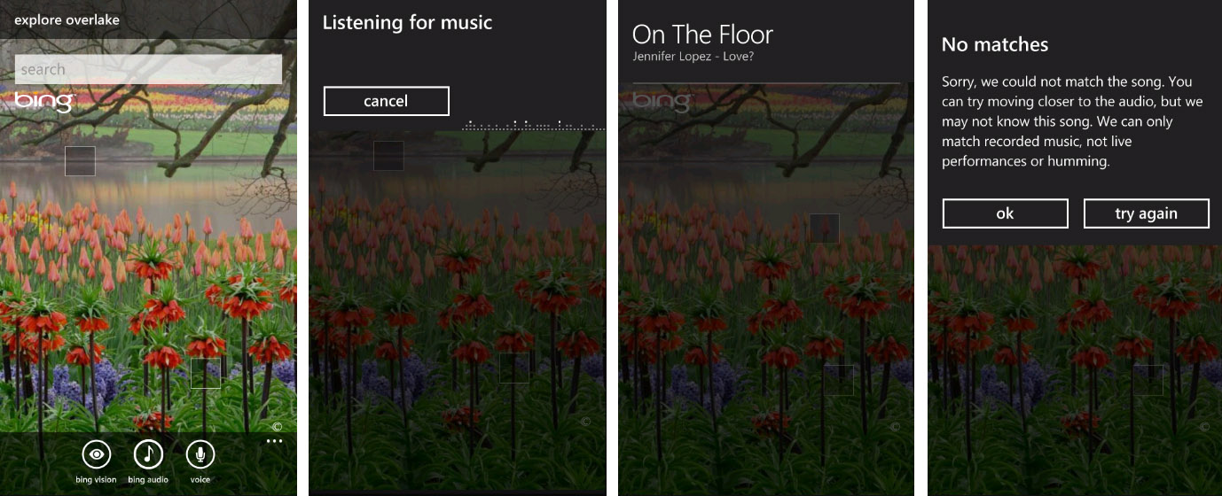 Among the new features in Windows Phone 7.5 there’s Bing Audio, a Shazam-like service integrated into the Bing search window. You’ll record a bit of the song you’re listening to, after pressing the Bing Audio button on the bottom toolbar and once a match is found, you’ll be shown a Marketplace result and given the chance to stream the song, download or purchase it.