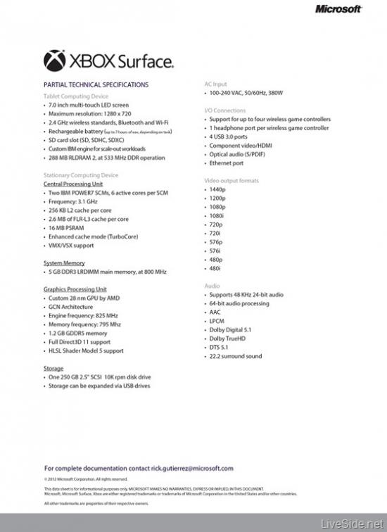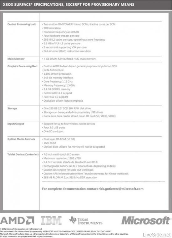 Dubbed Xbox Surface, the tablet packs a 7 inch 1280 x 720 pixel display, an SD card slot, 4GB of DRAM memory and 250 GB of storage. Other features include WiFi, Bluetooth a total of 12 cores of processing via the two IBM Power7 SCMs processors. Add to that 4 USB ports, Ethernet, HDMI and even a Kinect control method, maybe through a camera that will also serve for videocalls. Obviously, you should take all of the info with a grain of salt, but it does sound pretty plausible to me.