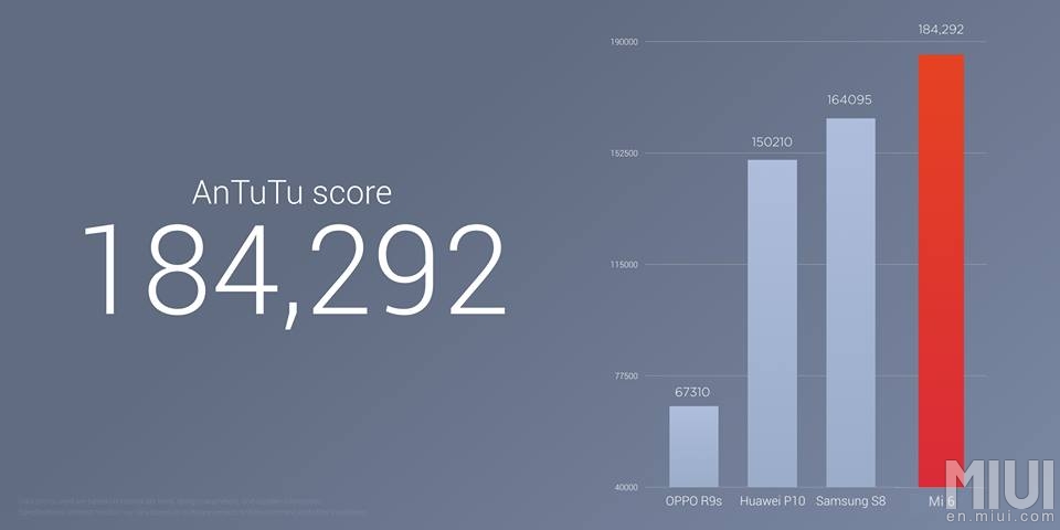 As far as hardware goes, we’ve got a 5.15 inch Full HD screen, that’s supposed to offer 600 nits of brightness, according to Xiaomi. There’s a Qualcomm Snapdragon 835 processor inside, 6 GB of RAM and 64 or 128 GB of storage. The Chinese maker also made public some figures and benchmark scores for the Mi 6, including the 184.292 points in AnTuTu.